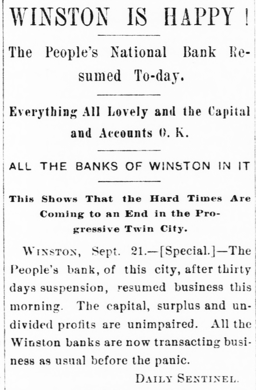 WINSTON IS HAPPY ! The People's National Bank Resumed To-day. Everything All Lovely and the Capital and Accounts G. K. ALL THE BANKS OF WINSTON IN IT This Shows That the Hard Times Are Coming to an End in the Progressive Twin City. WINSTON, Sept. 21.-[Special.]-The People's bank, of this city, after thirty days suspension, resumed business this morning. The capital, surplus and undivided profits are unimpaired. All the Winston banks are now transacting business as usual before the panic. DAILY SENTINEL.