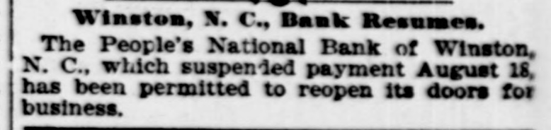 Winston, N. C., Bank Resumes. The People's National Bank of Winston, N. C., which suspended payment August 18, has been permitted to reopen its doors for business.