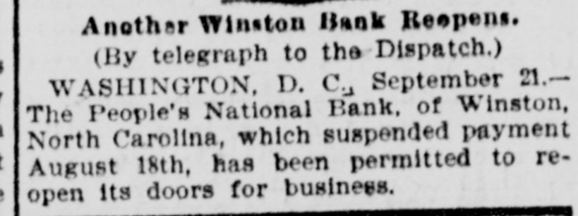 Another Winston Bank Reepens. (By telegraph to the Dispatch.) WASHINGTON, D. C., September 21.The People's National Bank, of Winston, North Carolina, which suspended payment August 18th, has been permitted to reopen its doors for business.