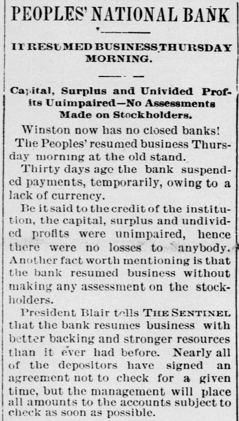 PEOPLES' NATIONAL BANK ITRESU MED BUSINESSTHURSDAY MORNING. Capital, Surplus and Univided Profits Unimpaired-No Assessments Made on Stockholders. Winston now has no closed banks! The Peoples' resumed business Thursday morning at the old stand. Thirty days ago the bank suspended payments, temporarily, owing to a lack of currency. Be itsaid to the credit of the institution, the capital, surplus and undivided profits were unimpaired, hence there were no losses to anybody. Another fact worth mentioning is that the bank resumed business without making any assessment on the stockholders. President Blair tells THE SENTINEL that the bank resumes business with better backing and stronger resources than it ever had before. Nearly all of the depositors have signed an agreement not to check for a given time, but the management will place all amounts to the accounts subject to check as soon as possible.