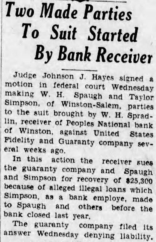Judge Johnson Hayes signed motion federal court Wednesday making Spaugh Taylor Simpson, parties the suit brought by lin, receiver Peoples National bank Winston against United States Fidelity Guaranty company several weeks In this action the receiver sues the guaranty company and Spaugh and for recovery of because alleged illegal which Simpson, bank employe, made to Spaugh and others before the closed year. The guaranty company filed answer Wednesday denying liability.
