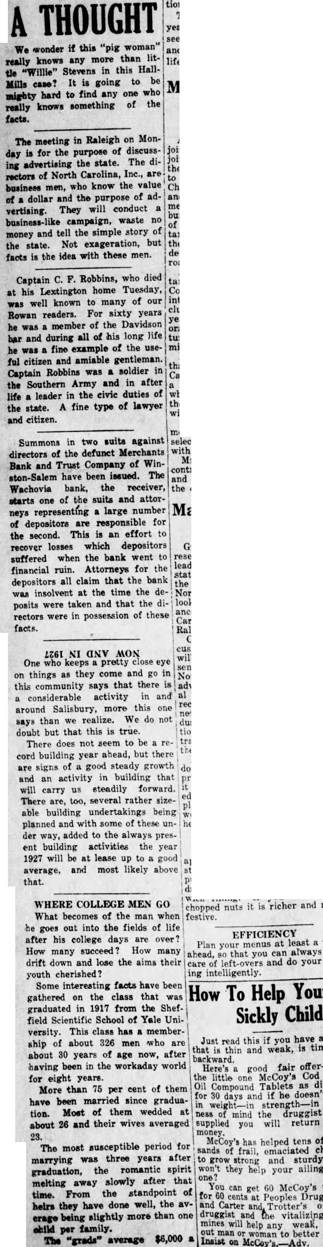 One who keeps pretty close eye on things as they come and go in this community says that there is considerable activity in and around Salisbury, more this one says than we realize. We do not doubt but that this is true. There does not seem to be cord building year ahead, but there are signs of a good steady growth and an activity in building that will carry us steadily forward. There are, too, several rather sizeable building undertakings being planned and with some of these under way, added to the always present building activities the year 1927 will be at lease up to good average, and most likely above that.
