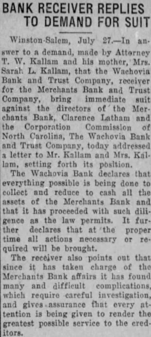 Winston Salem, July 27.-In answer to demand, made by Attorney T. W. Kallam and his mother, Mrs. Sarah L. Kallam, that the Wachovia Bank and Trust Company, receiver for the Merchants Bank and Trust Company, bring immediate suit against the directors of the Merchants Bank, Clarence Latham and the Corporation Commission of North Carolina, The Wachovia Bank and Trust Company, today addressed a letter to Mr. Kallam and Mrs. Kallam, setting forth its position. The Wachovia Bank declares that everything possible is being done to collect and reduce to cash all the assets of the Merchants Bank and that it has proceeded with such diligence as the law permits. It further declares that at the proper time all actions necessary or required will be brought. The receiver also points out that since it has taken charge of the Merchants Bank affairs it has found many and difficult complications, which require careful investigation, and gives assurance that every at. tention is being given to render the greatest possible service to the creditors.