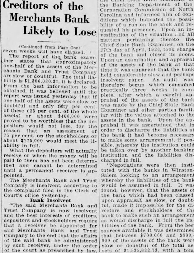 Chief State Bank on (Continued from Page One) 27th April, 1926, took charge weeks will have elapsed of the and closed Its doors. The report of the bank examUpon and appraisal that of the assets of the bank at that one-half the the Mertime it was apparent that the bank chants Bank and Trust Company and perhaps slow doubtful. The total liainsolvent paper. An audit was bility is declared. therefore begun which From the best information to be practically three to comobtained, was believed until the plete, after which careful apreport was issued that praisal of the assets of the bank one-half of the slow doubtful and only fifty per cent. was made by the Chief State Bank of these (25 per cent. of the whole Examiner and other parties familiar the attached to the assets) or about $400,000 were assets in the bank. Upon the approved to be the depositors lose, for the praisal it wal that in reason that order to discharge the liabilities of assessment of 75 per cent. on the stockholders the bank it had become necessary about would meet the 11- to arrangement, if posability in full sible, whereby the institution could What the depositors will actually be taken by another receive or the money will be institution and the liabilities dispaid to them has not been determ- charged in full. ined and cannot be determined "Negotiations were then instiuntil permanent receiver is ap- tuted with the banks in WinstonSalem an arrangement The Merchants Bank and Trust whereby the of the bank Company is would be in full. was the complaint filed in the Clerk of found, however, that the assets of Court's office yesterday. the bank which had been classed. Bank Insolvent appraisal. as slow, or doubtful, made It impossible for the rectors and stockholders the bank an harge in full the Ma. bilities the From the sources available was determined that between $700 and $800, 000 of the assets of the bank were slow or doubtful of the total sets of $1,535,622.7 with total