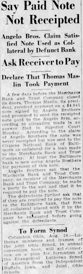A few days before the Merchants closed and Trust Company Thomas its its received on Angelo Brothers note signed by to receipted and promised the Angelo firm, note paid to made cording Court filed answer Monday According the claim the note was of Angelo Brothers sent to never receipted but Bank of Citizens National for loan made collateral more to the Merchants Bank Trust Company At least Baltimore Brothers bank for that the ask Angelo and Trust Wachovia Bank of the Merchants be made Trust Bank party and to the suit and that It be the note. required to pay further ask that The defendants the note required they that first to the It by the all collateral and Trust Merchants before going pany the defendants against