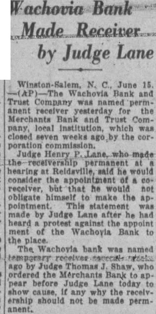 Winston-Salem, N. C., June 15. Wachovia Bank and Trust Company was named permanent receiver for the Merchants Bank and Trust Company, local Institution, which was closed seven weeks the corporation commission. Judge Henry Lane, who made the receivership permanent at hearing at Reidaville, said he would consider the appointment of & coreceiver, but that he would not obligate himself to make the ap. pointment This statement was made by Judge Lane after he had heard protest against the appoint ment of the Wachoyla Bank to the The Wachoyia bank was named ago by Judge Thomas Shaw, who ordered the Merchants Bank to appear before Judge Lane today to show cause, If any why the receivership should not be made perm-