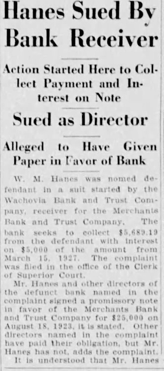 M Hanes nomed fendant suit started by the Wachovia Bank and Trust Comreceiver Merchants Bank and Trust Company. The bank collect the with interest amount from March 1927 The office of the Clerk Court Mr. Hanes and other directors the defunct bank named in the signed promissory note favor the Merchants Bank Trust Company for August Other the have their but Mr the understood that Mr. Hanes