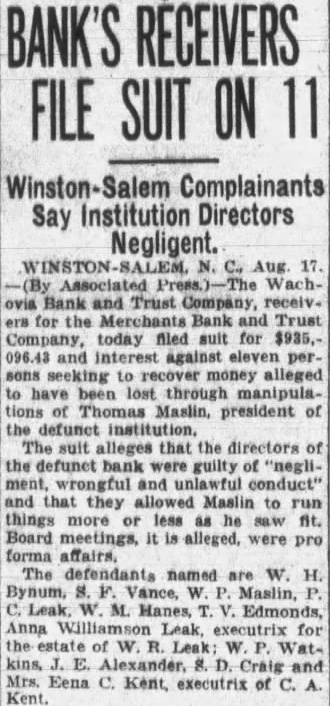 Winston-Salem Complainants Say Institution Directors Negligent. N. C., Aug. 17. Associated Wachovia Bank and Trust Company, receivers for the Merchants Bank and Trust Company, today filed suit for $935,and interest against eleven persons seeking to recover money alleged to have been lost through manipulations Thomas Maslin, president of the defunct institution. The suit alleges that the directors of the defunct bank were guilty of "negliment, wrongful and unlawful conduct" that allowed Maslin to run things more or less as he saw fit. Board meetings, it is alleged, were pro The defendants named are W. H. Bynum, S. F. Vance, W. P. Maslin, C. Leak W. M. Hanes, T. V. Edmonds, Anna Leak, for the estate of W. R. Leak W. Wat. kins, E. D. Craig Mrs. Eena C. Kent, executrix of C. A. Kent.