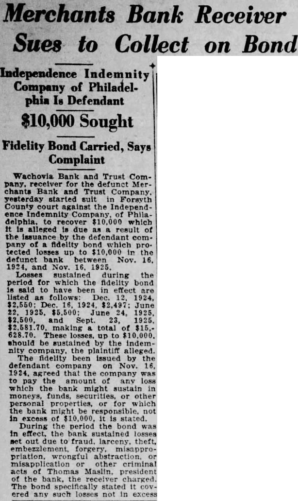 Wachovia Bank and Trust Company. receiver for the defunct Merchants Bank and Trust Company. yesterday started suit in Forsyth County court against the delphia. to recover $10,000 which It is alleged is due as result of the issuance by the defendant company of fidelity bond which pro. tected losses up to 000 the defunct bank between Nov. 16. 1924, and Nov. 16, 1925. Losses sustained during the period for which the fidelity bond said to have been in effect listed follows Dec. 12, 1924, $2,550 16, 1924 497: June $2,500. and Sept. 23, 1925. $2,581 70. making a total of $15,628.70. These losses. up to $10,000. should be sustained by the indemnity company. the plaintiff alleged. The fidelity been issued by the defendant company on Nov. 1924. agreed that the company was to pay the amount of any loss which the bank might sustain in moneys, funds, securities, or other personal properties, or for which the bank might be responsible. not in excess of $10,000. it is stated. During the period the bond was in effect, the bank sustained losses set out due to fraud. larceny. theft, priation. wrongful abstraction. or misapplication or other criminal acts of Thomas Maslin. president of the bank. the receiver charged. The bond specifically stated it COVered any such losses not in excess