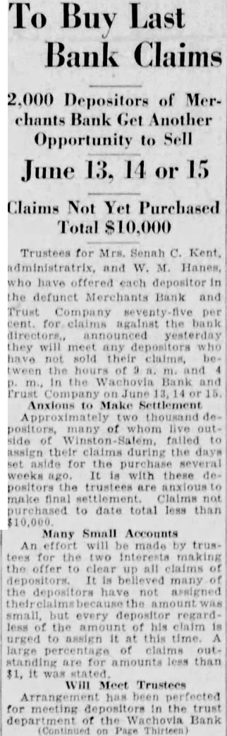 Trustees for Mrs. Senah C. Kent, administratrix, and W. M. Hanes, have offered each depositor the defunct Merchants Bank and Trust Company per cent. for claims against the bank yesterday they will meet any depositors have not In the Anxious to Make Settlement two thousand positors, many of whom live the set for the weeks It with these depositors the are anxious make final Claims purchased to date total less than