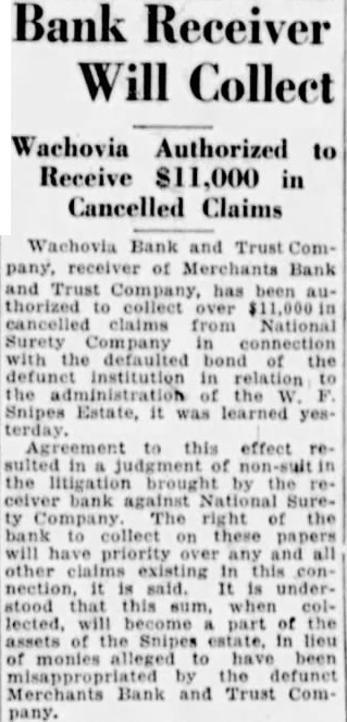 Wachovia Bank and Trust Company, receiver of Merchants Bank and Trust Company, has been authorized to collect over in cancelled claims from National Surety Company in connection with the defaulted bond of the defunct institution in relation the administration the W. Snipes Estate, it was learned yesterday. Agreement to this effect resulted in judgment of the litigation brought by the ceiver bank against National Surety Company The right of the bank to collect on these papers will have priority over any and all other claims existing in this conis said. It is understood that this sum, when collected. will become part of the assets of the Snipes estate, In lieu of monies alleged have been by the defunct Merchants Bank and Trust Company.
