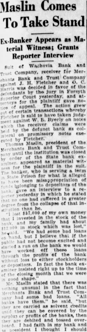 Banker Appears as Material Witness; Grants Reporter Interview of Bank and receiver for MerBank and Trust Company chants Fletcher and against decided in favor of the Harris by the jury in Forsyth Court and for the plaintiff gave The action grew transactions whereby of have taken judgFletcher W. Б. Byerly on notes against ment receiver claims were the the bank as colby promissory notes exeFletcher. by president of the Bank and Comthe institution closed until of the State appeared as material the plaintiff in the suit. who is serving term Prison for what alleged been of to of the gave an in which he stated yesterday had suffered in greater from the collapse of that inthan of my own money Invested in the stock of the family had about stock was had bad believe that the not become excited and public the bank would run worked off these loans the profits of the bank to either stockholders In fact the bank exright up to the time closing month that we were of shape. Maslin stated that there was Mr. unusual the fact that Merchants Bank and Trust Comsome bad loans. he as solvent credits be covered by the or profits of the then debited and tossed overhad faith my bank and president thought should