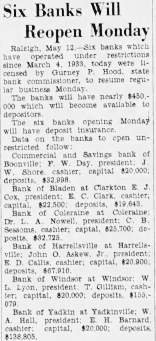 Six Banks Will Reopen Monday Raleigh, May banks which under restrictions operated since March today were Gurney state censed bank to resume reguMonday. The banks will have nearly 000 which will become available depositors six banks opening Monday will have deposit the banks to open unrestricted follow Commercial and Savings bank Day Shore cashier: capital $20,000; $32,998 Bank Bladen at Clarkton E. Cox. president: Clark cashier; Bank of Coleraine Coleraine Bank of at Harrellsville: John O. Askew president: Callis cashier; capital, $20,900; deposits, Bank of Windsor at Windsor 079 Bank of Yadkin at Yadkinville: W A. Hall, president Barnard cashier: capital, $138,805