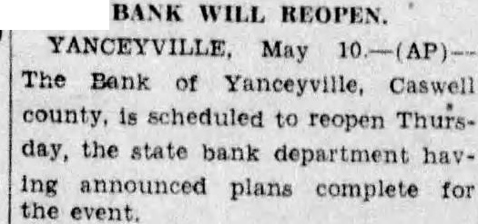 Article (Greensboro Record, 1932-05-10) reports the state bank department arranged for the Bank of Yanceyville to reopen Thursday. No article text about the original suspension or any run is provided; suspension is inferred and appears to involve state authorities (hence government action). Reopening date inferred as 1932-05-12 (the Thursday after May 10, 1932).