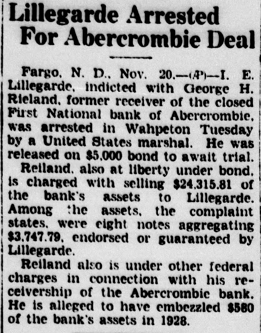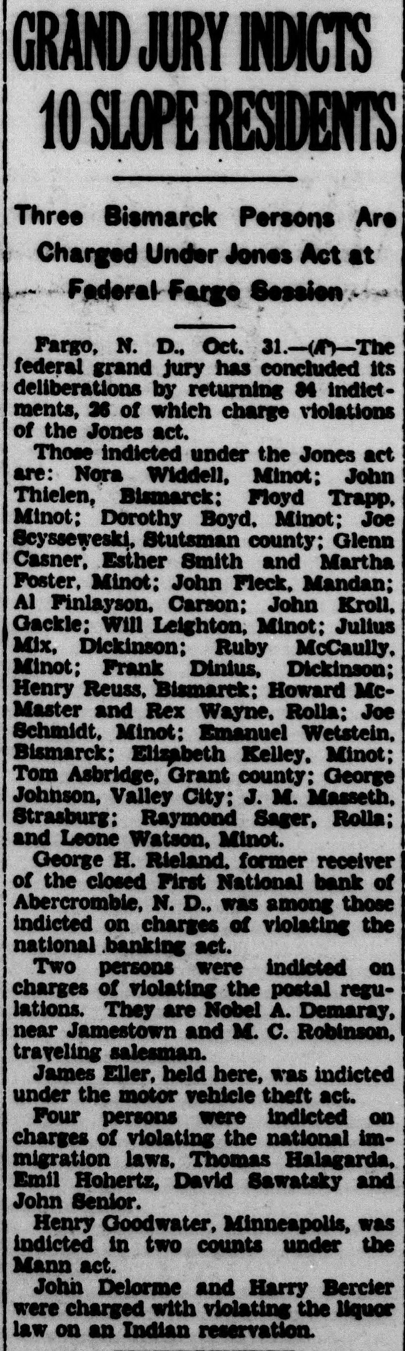 GRAND JURY INDICTS 10 SLOPE RESIDENTS Three Bismarck Persons Are Charged Under Jones Act at Federal Fargo Session Fargo, N. D., Oct. 31.-(n-The federal grand jury has concluded its deliberations by returning 84 indictments, 26 of which charge violations of the Jones act. Those indicted under the Jones act are: Nora Widdell, Minot; John Thielen, Bismarck: Floyd Trapp, Dorothy Boyd, Minot; Joe Stutsman Minot: Scysseweski, county: and Martha Glenn Casner, Esther Smith John Carson; Foster, Al Finlayson. Minot: Fleck, John Mandan; Kroll, Gackle: will Leighton, Minot; Julius Mix, Dickinson: Ruby McCaully. Minot; Frank Dinius, Dickinson; Henry Reuss, Bismarck: Howard McMaster and Rex Wayne, Rolla: Joe Schmidt. Minot: Emanuel Wetstein, Bismarck: Elizabeth Kelley. Minot; Tom Asbridge, Grant county: George Johnson, Valley City: J. M. Masseth, Strasburg: Raymond Sager, Rolla; and Leone Watson, Minot. George H. Rieland. former receiver of the closed First National bank of Abercromble, N. D., was among those indicted on charges of violating the national banking act. Two persons were indicted on charges of violating the postal regulations. They are Nobel A. Demaray, near Jamestown and M. C. Robinson, traveling salesman. James Eller, held here, was indicted under the motor vehicle theft act. Four persons were indicted on charges of violating the national immigration laws. Thomas Halagarda, Emil Hohertz, David Sawatsky and John Senior. Henry Goodwater, Minneapolis, was indicted in two counts under the Mann act. John Delorme and Harry Bercier were charged with violating the liquor law on an Indian reservation.