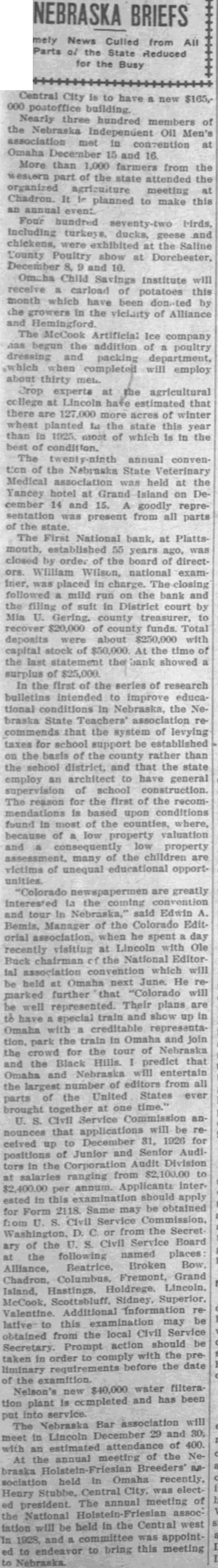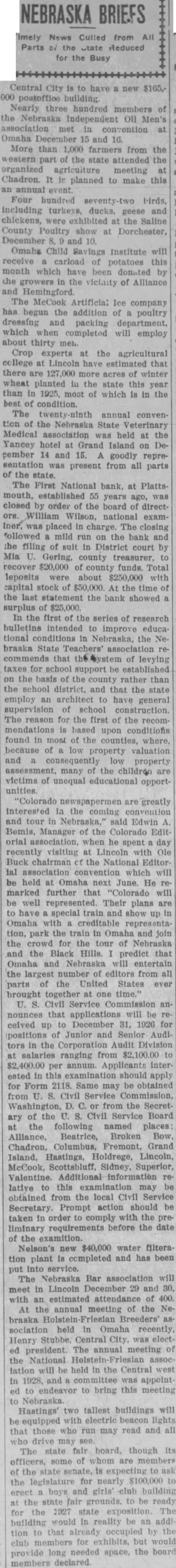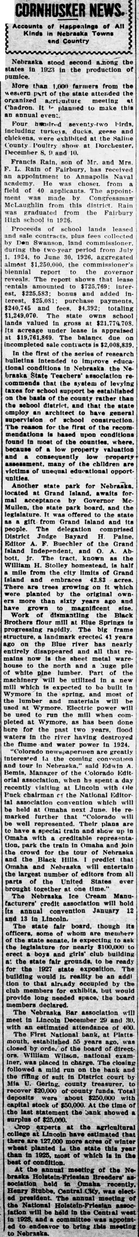 Happenings of Kinds Nebraska Towns Country Nebraska stood second a.nong the states in 1923 in the production of pumice. More than 1,000 farmers from the western part the attended the organized agrizuiture meeting Chadron. planned to make this an annual even: including turkeys ducks. geese and chickens, the Saline County Poultry show Dorchester, December 10. Francis of Mr. and Mrs. Rain of Fairbury, has received an appointment Annapolis Naval academy. He choser from field of applicants. The appointment made Congressman from this district Rain graduated the Fairbury school in Proceeds school lands leased sale contracts plus fees collected by Don Swanson land commissioner, during the two-year period from July June aggregated almost $1,250,000 the commissioner's biennial report the governor reveals. The report shows that lease entals amounted Interest, $225,583: and added $240,745 and fees, totaling $1,249,070. The state owns school lands valued In gross Its acreage under lease appraised $19,761,869. The balance due on incompleted In the first of the series research bulletins intended to improve educational conditions in Nebraska the Nebraska State Teachers' that the system of levying for school support be established on the basis the county rather than the school district. and that the state employ architect to have general supervision school construction. reason for the first of the recommendations based upon conditions found in most of the counties. where, because low property valuation and property many the children are victims unequal educational unities Another state park for Nebraska, located at Grand Island, awaits for acceptance by Governor McMullen. the state park board. and the legislature. was offered to the state gift from Grand Island and its people. The delegation comprised District Judge Bayard Paine. Editor of the Grand Island Independent. and AbThe tract, known the William H. Stolley homestead, half mile from the city limits of Grand Island and embraces 42.83 acres. There trees on which were planted by the original own. ers more than sixty years ago and grown magnificent size. Work dismantling the Black Brothers flour mill at Blue Springs progressing rapidly. The big frame structure. landmark erected years ago Blue river has nearly entirely disappeared and all that mains now the sheet metal house the north and huge pile white pine lumber Part of the will utilized mill which expected to be built In the spring. and most the lumber and materials will used at Wymore. Electric power will be run the mill when pleted Wymore, has been done here for the past two years, flood waters the river destroyed the flume and water power in 1924. Colorado are greatly interested the coming convention and tour in Nebraska." said Edwin Bemis, Manager of the Colorado Edit orial association. when be spent day recently visiting Lincoln Ole Ruck chairman the Editor ial convention which will be held Omaha next June He marked further "Colorado will well represented. Their plans are to have special train and show up Omaha with creditable park the train In Omaha and the crowd for the tour of Nebraska and the Black Hills. predict that Omaha and Nebraska will entertain the largest number of editors from all parts of the United States ever brought together one time. The Nebraska Ice Cream Manufacturers' credit association will hold Its annual convention January 12 and in Lincoln. The state fair board, though Its officers, some of whom members of the state senate, is expecting the legislature for nearly $100,000 erect boys girls' club building the state fair grounds, to be ready for the 1927 state exposition. The building would it. reality be an addi tion to that already occupied by the club for exhibits. but would provide long needed space, the board declared. The Nebraska Bar association will meet in Lincoln December 29 and with an estimated attendance of 400. The First National bank, Platts mouth. 55 years was closed orde. the board direct William Wilson. national exam Iner, placed charge. closing followed mild run on the and the finng suit District court by Mia Gering. county treasurer, recover $20,000 county funds. Total deposits were about $250,000 with capital stock of $50,000. At the time the last statement the bank showed surplus $25,000. Crop experts the agricultural Lincoln have estimated that there acres of winter wheat planted the state this year than 1925, most which is in the meeting of the Noheld Omaha recently. Heary Central City, was electof president. The annual meeting National will be the west and committee was appointto bring this meeting