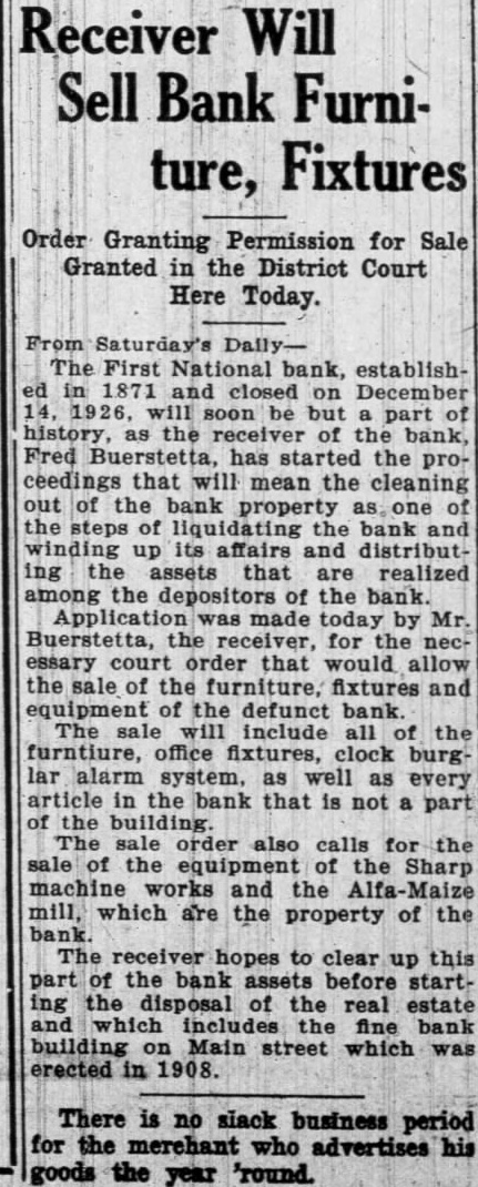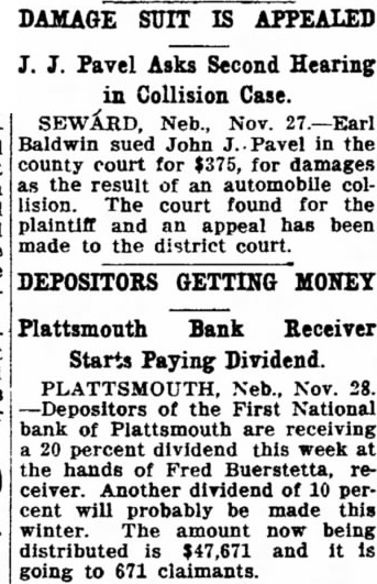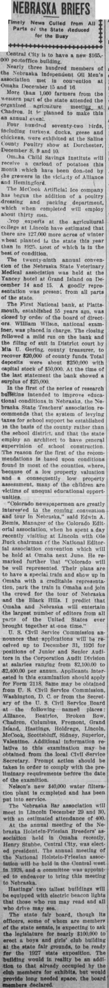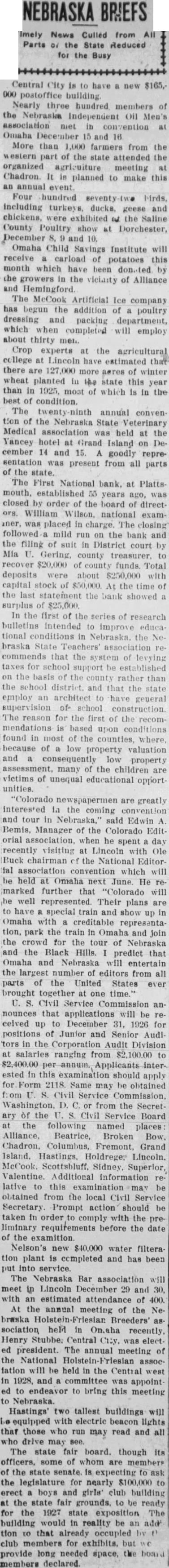 Happenings of Kinds Nebraska Towns Country Nebraska stood second a.nong the states in 1923 in the production of pumice. More than 1,000 farmers from the western part the attended the organized agrizuiture meeting Chadron. planned to make this an annual even: including turkeys ducks. geese and chickens, the Saline County Poultry show Dorchester, December 10. Francis of Mr. and Mrs. Rain of Fairbury, has received an appointment Annapolis Naval academy. He choser from field of applicants. The appointment made Congressman from this district Rain graduated the Fairbury school in Proceeds school lands leased sale contracts plus fees collected by Don Swanson land commissioner, during the two-year period from July June aggregated almost $1,250,000 the commissioner's biennial report the governor reveals. The report shows that lease entals amounted Interest, $225,583: and added $240,745 and fees, totaling $1,249,070. The state owns school lands valued In gross Its acreage under lease appraised $19,761,869. The balance due on incompleted In the first of the series research bulletins intended to improve educational conditions in Nebraska the Nebraska State Teachers' that the system of levying for school support be established on the basis the county rather than the school district. and that the state employ architect to have general supervision school construction. reason for the first of the recommendations based upon conditions found in most of the counties. where, because low property valuation and property many the children are victims unequal educational unities Another state park for Nebraska, located at Grand Island, awaits for acceptance by Governor McMullen. the state park board. and the legislature. was offered to the state gift from Grand Island and its people. The delegation comprised District Judge Bayard Paine. Editor of the Grand Island Independent. and AbThe tract, known the William H. Stolley homestead, half mile from the city limits of Grand Island and embraces 42.83 acres. There trees on which were planted by the original own. ers more than sixty years ago and grown magnificent size. Work dismantling the Black Brothers flour mill at Blue Springs progressing rapidly. The big frame structure. landmark erected years ago Blue river has nearly entirely disappeared and all that mains now the sheet metal house the north and huge pile white pine lumber Part of the will utilized mill which expected to be built In the spring. and most the lumber and materials will used at Wymore. Electric power will be run the mill when pleted Wymore, has been done here for the past two years, flood waters the river destroyed the flume and water power in 1924. Colorado are greatly interested the coming convention and tour in Nebraska." said Edwin Bemis, Manager of the Colorado Edit orial association. when be spent day recently visiting Lincoln Ole Ruck chairman the Editor ial convention which will be held Omaha next June He marked further "Colorado will well represented. Their plans are to have special train and show up Omaha with creditable park the train In Omaha and the crowd for the tour of Nebraska and the Black Hills. predict that Omaha and Nebraska will entertain the largest number of editors from all parts of the United States ever brought together one time. The Nebraska Ice Cream Manufacturers' credit association will hold Its annual convention January 12 and in Lincoln. The state fair board, though Its officers, some of whom members of the state senate, is expecting the legislature for nearly $100,000 erect boys girls' club building the state fair grounds, to be ready for the 1927 state exposition. The building would it. reality be an addi tion to that already occupied by the club for exhibits. but would provide long needed space, the board declared. The Nebraska Bar association will meet in Lincoln December 29 and with an estimated attendance of 400. The First National bank, Platts mouth. 55 years was closed orde. the board direct William Wilson. national exam Iner, placed charge. closing followed mild run on the and the finng suit District court by Mia Gering. county treasurer, recover $20,000 county funds. Total deposits were about $250,000 with capital stock of $50,000. At the time the last statement the bank showed surplus $25,000. Crop experts the agricultural Lincoln have estimated that there acres of winter wheat planted the state this year than 1925, most which is in the meeting of the Noheld Omaha recently. Heary Central City, was electof president. The annual meeting National will be the west and committee was appointto bring this meeting
