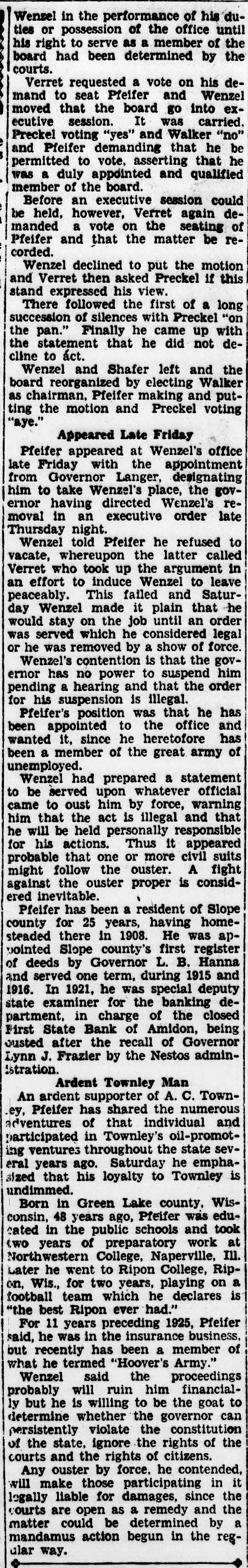 Wenzel in the performance of his duties or possession of the office until his right to serve as a member of the board had been determined by the courts. Verret requested a vote on his demand to seat Pfeifer and Wenzel moved that the board go into executive session. It was carried. Preckel voting "yes" and Walker "no" and Pfeifer demanding that he be permitted to vote, asserting that he was a duly appointed and qualified member of the board. Before an executive session could be held, however, Verret again demanded a vote on the seating of Pfeifer and that the matter be recorded. Wenzel declined to put the motion and Verret then asked Preckel if this stand expressed his view. There followed the first of a long succession of silences with Preckel "on the pan." Finally he came up with the statement that he did not decline to act. Wenzel and Shafer left and the board reorganized by electing Walker as chairman, Pfeifer making and putting the motion and Preckel voting "aye." Appeared Late Friday Pfeifer appeared at Wenzel's office late Friday with the appointment from Governor Langer, designating him to take Wenzel's place, the governor having directed Wenzel's removal in an executive order late Thursday night. Wenzel told Pfeifer he refused to vacate, whereupon the latter called Verret who took up the argument in an effort to induce Wenzel to leave peaceably. This failed and Saturday Wenzel made it plain that he would stay on the job until an order was served which he considered legal or he was removed by a show of force. Wenzel's contention is that the governor has no power to suspend him pending a hearing and that the order for his suspension is illegal. Pfeifer's position was that he has been appointed to the office and wanted it, since he heretofore has been a member of the great army of unemployed. Wenzel had prepared a statement to be served upon whatever official came to oust him by force, warning him that the act is illegal and that he will be held personally responsible for his actions. Thus it appeared probable that one or more civil suits might follow the ouster. A fight against the ouster proper is considered inevitable. Pfeifer has been a resident of Slope county for 25 years, having homesteaded there in 1908. He was appointed Slope county's first register of deeds by Governor L. B. Hanna and served one term, during 1915 and 1916. In 1921, he was special deputy state examiner for the banking department, in charge of the closed First State Bank of Amidon, being Justed after the recall of Governor Lynn J. Frazier by the Nestos administration. Ardent Townley Man An ardent supporter of A. C. Towney, Pfeifer has shared the numerous adventures of that individual and participated in Townley's oil-promoting ventures throughout the state several years ago. Saturday he emphasized that his loyalty to Townley is undimmed. Born in Green Lake county, Wisconsin, 48 years ago, Pfeifer was educated in the public schools and took two years of preparatory work at Northwestern College, Naperville, Ill. Later he went to Ripon College, Ripon, Wis., for two years, playing on a football team which he declares is "the best Ripon ever had." For 11 years preceding 1925, Pfeifer said, he was in the insurance business, out recently has been a member of what he termed "Hoover's Army." Wenzel said the proceedings probably will ruin him financially but he is willing to be the goat to determine whether the governor can persistently violate the constitution of the state, ignore the rights of the courts and the rights of citizens. Any ouster by force, he contended, will make those participating in it legally liable for damages, since the courts are open as a remedy and the matter could be determined by a mandamus action begun in the regular way.