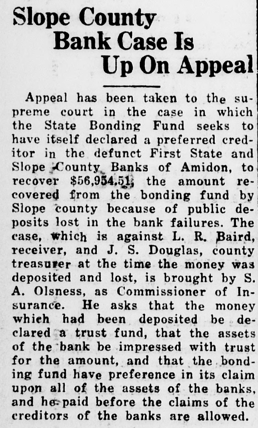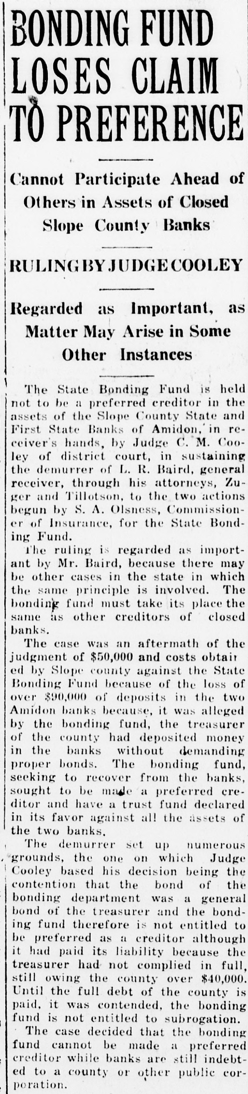 BONDING FUND LOSES CLAIM TO PREFERENCE Cannot Participate Ahead of Others in Assets of Closed Slope County Banks RULINGBYJUDGECOOLEY Regarded as Important, as Matter May Arise in Some Other Instances The State Bonding Fund is held not to be a preferred creditor in the assets of the Slope County State and First State Banks of Amidon, in receiver's hands, by Judge C. M. Cooley of district court, in sustaining the demurrer of L. R. Baird, general receiver, through his attorneys, Zuger and Tillotson, to the two actions begun by S. A. Olsness, Commissioner of Insurance, for the State Bonding Fund. The ruling is regarded as important by Mr. Baird, because there may be other cases in the state in which the same principle is involved. The bonding fund must take its place the same as other creditors of closed banks. The case was an aftermath of the judgment of $50,000 and costs obtain ed by Slope county against the State Bonding Fund because of the loss of over $90,000 of deposits in the two Amidon banks because, it was alleged by the bonding fund, the treasurer of the county had deposited money in the banks without demanding proper bonds. The bonding fund, seeking to recover from the banks, sought to be made a preferred creditor and have a trust fund declared in its favor against all the assets of the two banks. The demurrer set up numerous grounds, the one on which Judge Cooley based his decision being the contention that the bond of the bonding department was a general bond of the treasurer and the bonding fund therefore is not entitled to be preferred as a creditor although it had paid its liability because the treasurer had not complied in full, still owing the county over $40,000. Until the full debt of the county is paid, it was contended, the bonding fund is not entitled to subrogation. The case decided that the bonding fund cannot be made a preferred creditor while banks are still indebted to a county or other public corporation.