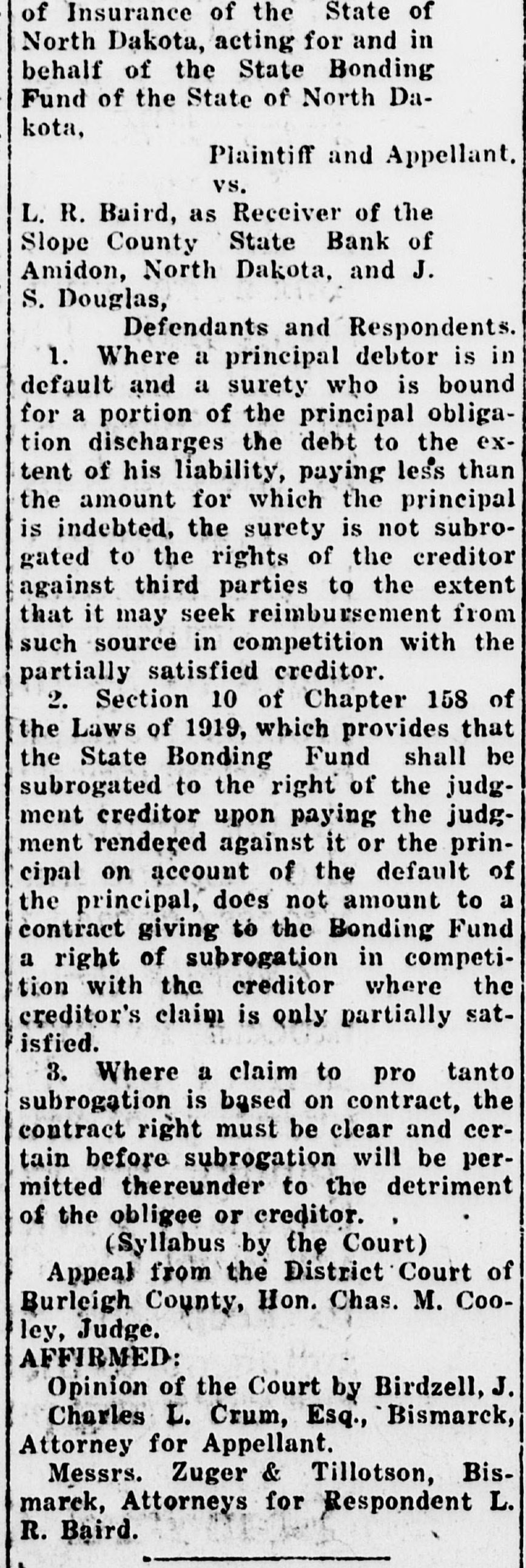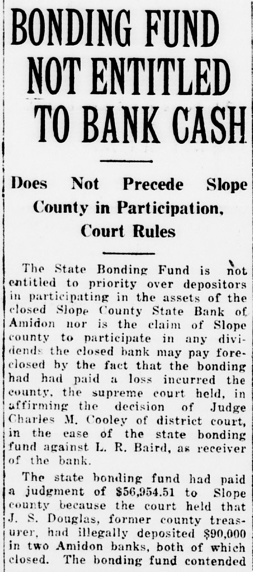 BONDING FUND LOSES CLAIM TO PREFERENCE Cannot Participate Ahead of Others in Assets of Closed Slope County Banks RULINGBYJUDGECOOLEY Regarded as Important, as Matter May Arise in Some Other Instances The State Bonding Fund is held not to be a preferred creditor in the assets of the Slope County State and First State Banks of Amidon, in receiver's hands, by Judge C. M. Cooley of district court, in sustaining the demurrer of L. R. Baird, general receiver, through his attorneys, Zuger and Tillotson, to the two actions begun by S. A. Olsness, Commissioner of Insurance, for the State Bonding Fund. The ruling is regarded as important by Mr. Baird, because there may be other cases in the state in which the same principle is involved. The bonding fund must take its place the same as other creditors of closed banks. The case was an aftermath of the judgment of $50,000 and costs obtain ed by Slope county against the State Bonding Fund because of the loss of over $90,000 of deposits in the two Amidon banks because, it was alleged by the bonding fund, the treasurer of the county had deposited money in the banks without demanding proper bonds. The bonding fund, seeking to recover from the banks, sought to be made a preferred creditor and have a trust fund declared in its favor against all the assets of the two banks. The demurrer set up numerous grounds, the one on which Judge Cooley based his decision being the contention that the bond of the bonding department was a general bond of the treasurer and the bonding fund therefore is not entitled to be preferred as a creditor although it had paid its liability because the treasurer had not complied in full, still owing the county over $40,000. Until the full debt of the county is paid, it was contended, the bonding fund is not entitled to subrogation. The case decided that the bonding fund cannot be made a preferred creditor while banks are still indebted to a county or other public corporation.