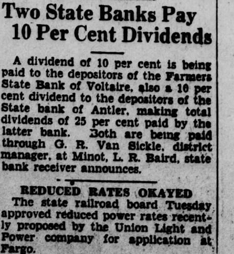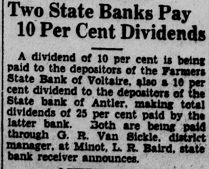 Two State Banks Pay 10 Per Cent Dividends A dividend of 10 per cent is being paid to the depositors of the Farmers State Bank of Voltaire, also a 10 per cent dividend to the depositors of the State bank of Antler, making total dividends of 25 per cent paid by the latter bank. Both are being paid through G. R. Van Sickle. district manager, at Minot, L. R. Baird, state bank receiver announces.