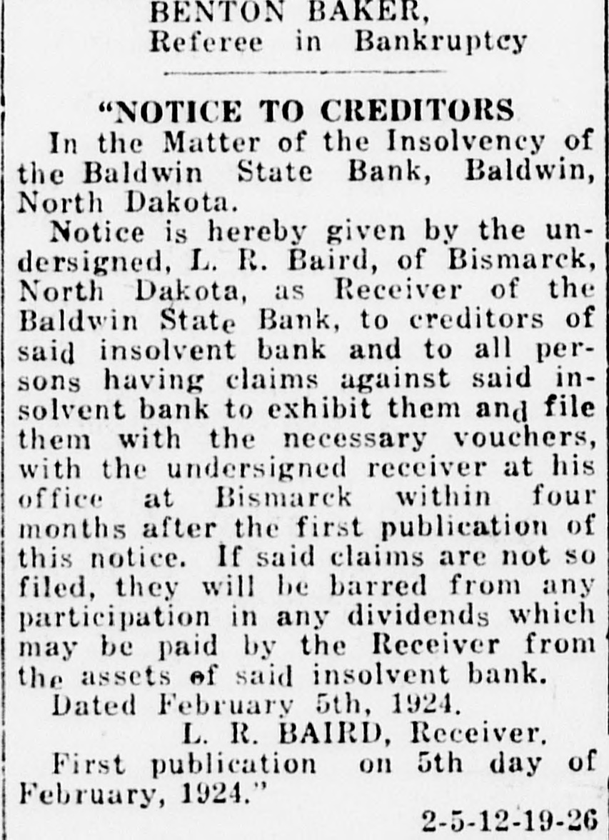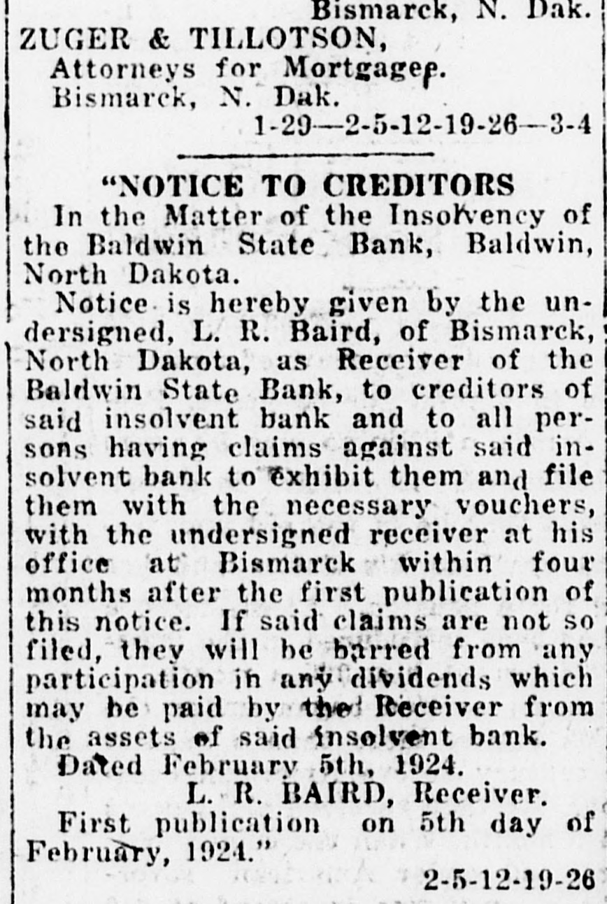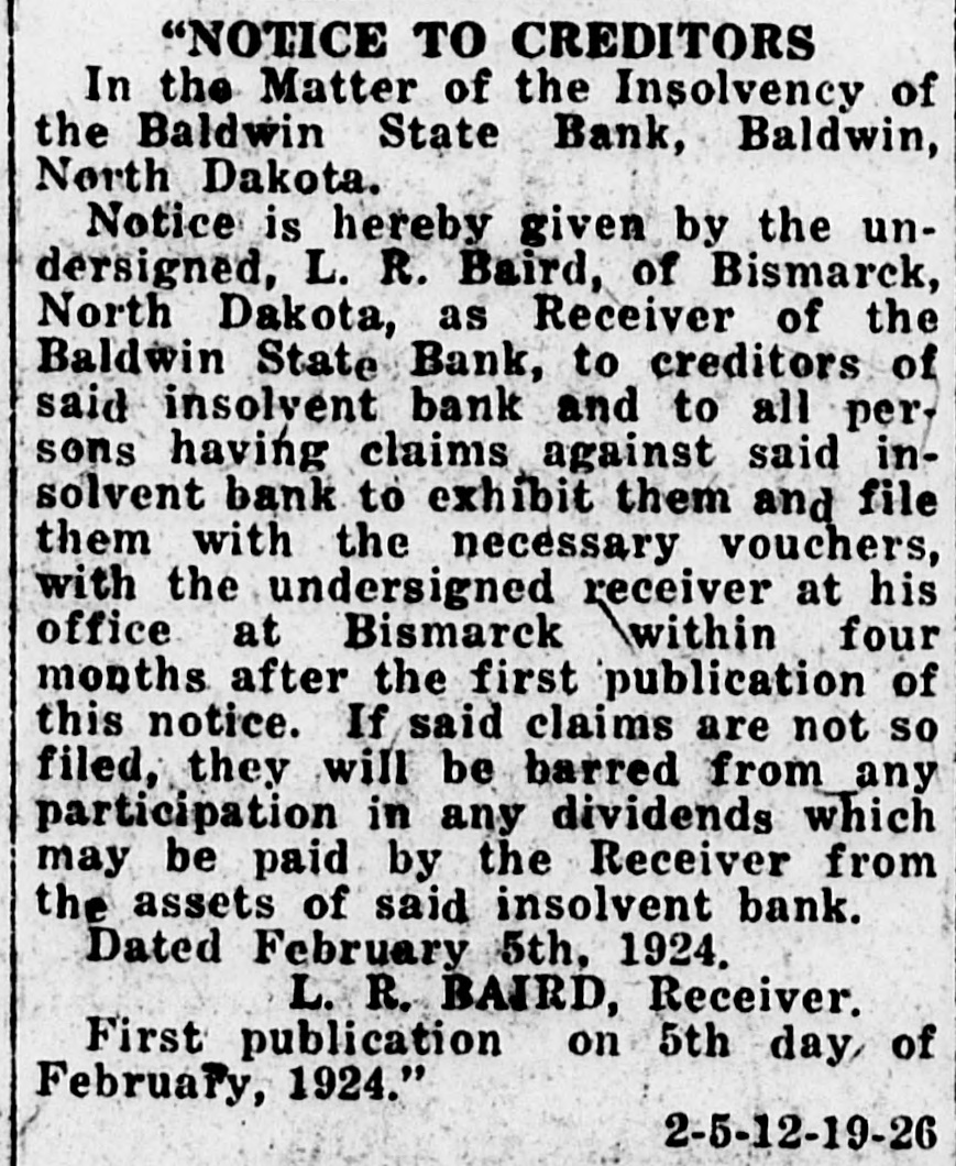 behind in his payments to the bank to such an extent that he decided to let his interest go. He gave the bank a deed in March, 1932, which was recorded in December of that year. W still was living on the farm and thought he still might swing the deal if he could get a federal land bank loan. Foreclosure was had to clear the title and W now owns the farm and the Bank of North Dakota is out of the picture, the land bank having made a loan on the property. L lost a lot. The Bank of North Dakota lost a little. Mr. and Mrs. J got a loan of $800 on 160 acres near Arena in September, 1929, and it was foreclosed on July 25, 1933, on two of several past-due instalments. They had paid only one instalment of $60 and had let the taxes slide. They gave the bank consent to foreclose. Purchase of the land by J in the first place apparently was a speculation. He never lived on the place and never paid anything on two inferior mortgages. The land was purchased from the receiver of state banks at the time J got the $800 loan, a natural inference being that this was part of the purchase price. The receiver took a second mortgage for the balance. Began Back in 1919 This particular piece of land has been knocking about since 1919, when the Farmers and Merchants State Bank of Driscoll foreclosed on one F. In 1924 it was sold to K, who deeded it back the same year, apparently one of those deals in which bankers have been known to participate but which are more or less a mystery to the general public. It may not be true in this case, but banks have been known to do such things in order to have their paper in good shape to show the bank examiner. At any rate, the deed given by K back to the bank was filed in 1926. Foreclosure was had again to insure the title and in 1927 it came to the bank receiver. The foreclosure didn't worry Mr. and Mrs. J. They still have their home place and are not interested in floating the deal again through a federal loan. More Tragic Case Noted The case of Mr. and Mrs. H is different only in its details but is more tragic. They bought 160 acres near Baldwin in December, 1915, but things apparently didn't go too well, despite the war boom, for in 1919 up popped a whole series of mortgages. On Nov. 20 of that year the Bank of North Dakota gave a first-mortgage loan of $1,800; one C took a secondmortgage loan of $1,500 and the Baldwin State Bank took a third mortgage for $3,317.45. All this happened within five days and it seems obvious that the Baldwin bank took the third mortage as some sort of security for bills it couldn't collect. In 1923, C foreclosed his second mortgage and took over the Bank of North Dakota first-mortgage, the Baldwin bank having closed in the meantime and its equity being worthless. Then C died and the property was left without management. The Bank of North Dakota foreclosed it without protest and set about the task of selling it, if possible. H was held ineligible for a land bank loan because he lived too far from the place and besides he had other fish to fry by this time. An effort was made to get one of C's heirs to apply for a loan but on August 6 he said he didn't want anything to do with it. Meantime, H appeared in the bank's records in another place. In 1924 he moved to a farm near Bismarck, this being the time C's foreclosure matured. The plot was one of 80 acres. In 1928 he got a $1,100 loan from the Bank of North Dakota but he never paid all of the first instalment and has paid nothing since. No taxes were paid since 1928. Dced Obtained in 1933 The property was foreclosed in 1932 and deed was obtained in 1933. The property has been refinanced by the federal land bank which advanced $1,600 on a first and second mortgage, the latter being a commissioner's loan. The Bank of North Dakota got out of its second deal with H by accepting $1,259.34 for an