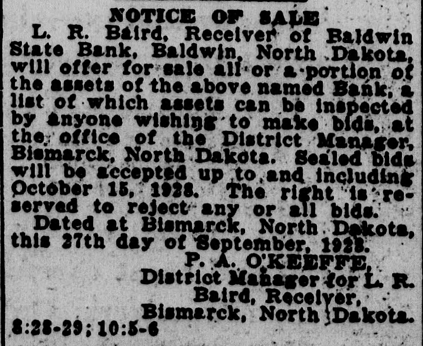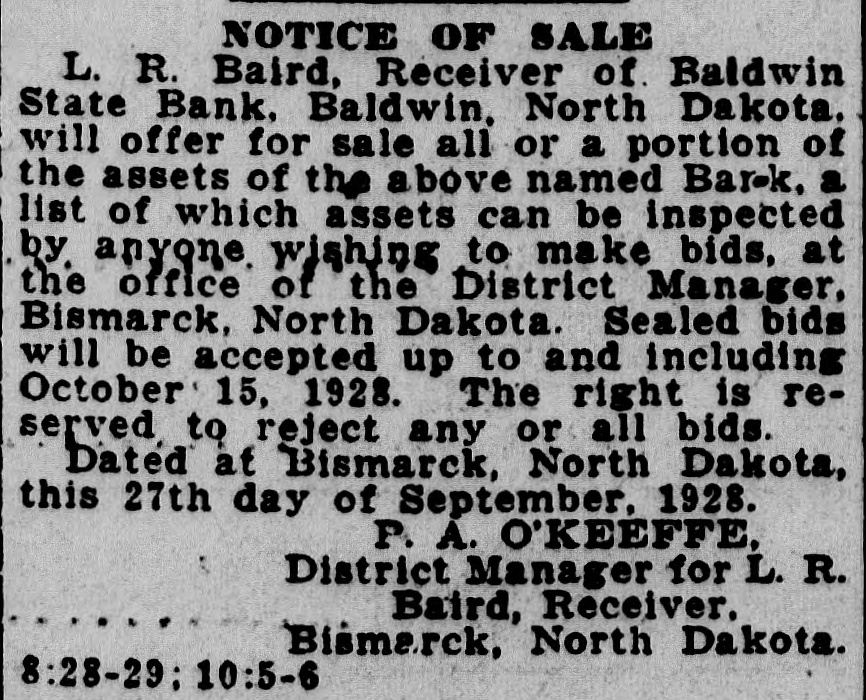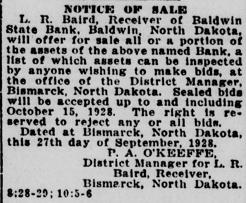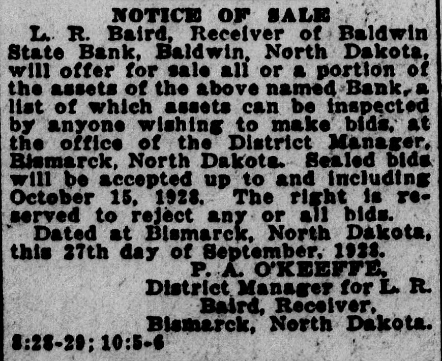NOTICE OF SALE L. R. Baird, Receiver of. Baldwin State Bank. Baldwin, North Dakota. will offer for sale all or a portion of the assets of the above named Bar-k, a list of which assets can be inspected by anyone. wishing to make bids, at the office of the District Manager, Bismarck, North Dakota. Sealed bids will be accepted up to and including October 15, 1928. The right is reserved to reject any or all bids. Dated at Bismarck, North Dakota, this 27th day of September, 1928. P. A. O'KEEFFE, District Manager for L. R. Baird, Receiver. Bismarck, North Dakota. 8:28-29; 10:5-6