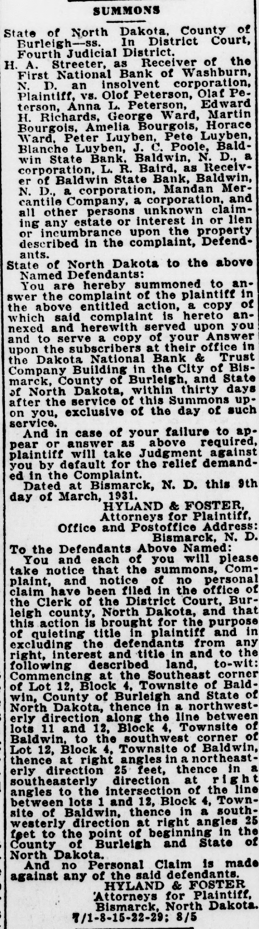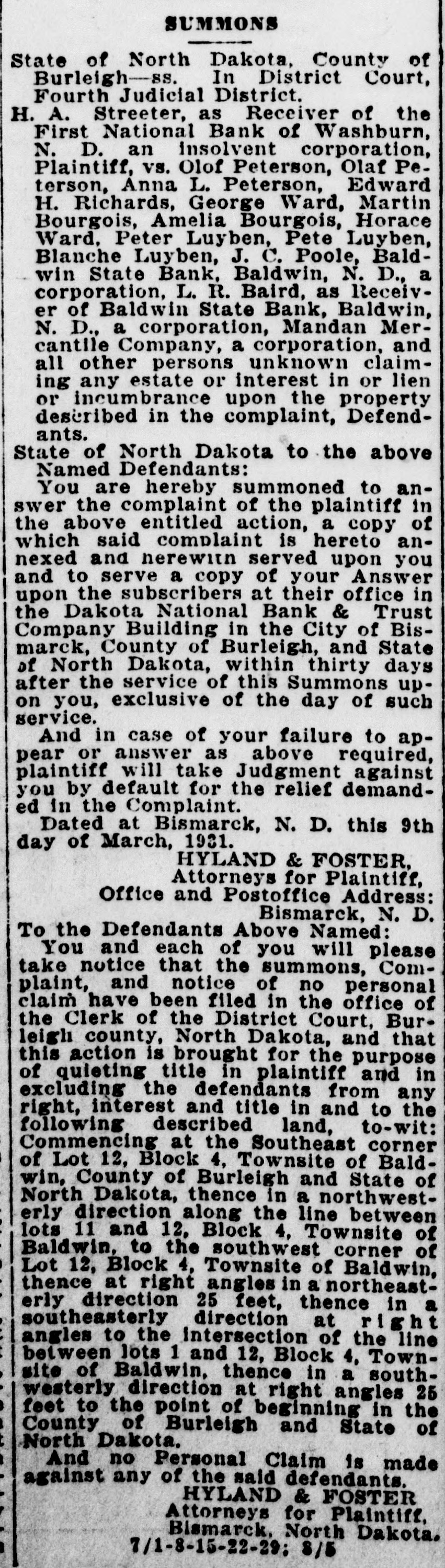 SUMMONS State of North Dakota, County of Burleigh-ss. In District Court, Fourth Judicial District. H. A. Streeter, as Receiver of the First National Bank of Washburn, N. D. an insolvent corporation, Plaintiff, vs. Olof Peterson, Olaf Peterson, Anna L. Peterson, Edward H. Richards, George Ward, Martin Bourgois, Amelia Bourgois, Horace Ward, Peter Luyben, Pete Luyben, Blanche Luyben, J. C. Poole, Baldwin State Bank, Baldwin, N. D., a corporation, L. R. Baird, as Receiver of Baldwin State Bank, Baldwin, N. D., a corporation, Mandan Mercantile Company, a corporation, and all other persons unknown claiming any estate or interest in or lien or incumbrance upon the property described ants. in the complaint, DefendState of North Dakota to the above Named Defendants: You are hereby summoned to answer the complaint of the plaintiff in the above entitled action, a copy of which said complaint is hereto annexed and herewith served upon you and to serve a copy of your Answer upon the subscribers at their office in the Dakota National Bank & Trust Company Building in the City of Bismarck, County of Burleigh, and State of North Dakota, within thirty days after the service of this Summons upservice. on you, exclusive of the day of such And in case of your failure to appear or answer as above required, plaintiff will take Judgment against you by default for the relief demanded in the Complaint. Dated at Bismarck, N. D. this 9th day of March, 1931. HYLAND & FOSTER, Attorneys for Plaintiff, Office and Postoffice Address: Bismarck, N. D. To the Defendants Above Named: You and each of you will please take notice that the summons, Complaint, and notice of no personal claim have been filed in the office of the Clerk of the District Court, Burleigh county, North Dakota, and that this of action is brought for the purpose quieting title in plaintiff and in excluding the defendants from right, interest and title in and to any the following described land, to-wit: of Commencing at the Southeast Lot 12, Block 4, Townsite of corner BaldNorth win, County of Burleigh and State, of Dakota. thence in a northwesterly lots direction along the line between 11 and 12, Block 4, Townsite of Lot Baldwin, to the southwest corner of thence 12, Block 4, Townsite of Baldwin, at right angles in a northeasterly direction 25 feet, thence in southeasterly direction at right a angles to the intersection of the line between lots 1 and 12, Block 4, Townsite of Baldwin, thence in a southwesterly direction at right angles 25 feet to the point of beginning in the County of Burleigh and State of North Dakota. And no Personal Claim is made against any of the said defendants. HYLAND & FOSTER Attorneys for Plaintiff, Bismarck, North Dakota. 7/1-8-15-22-29; 8/5