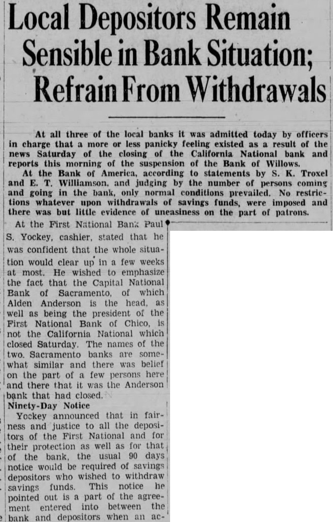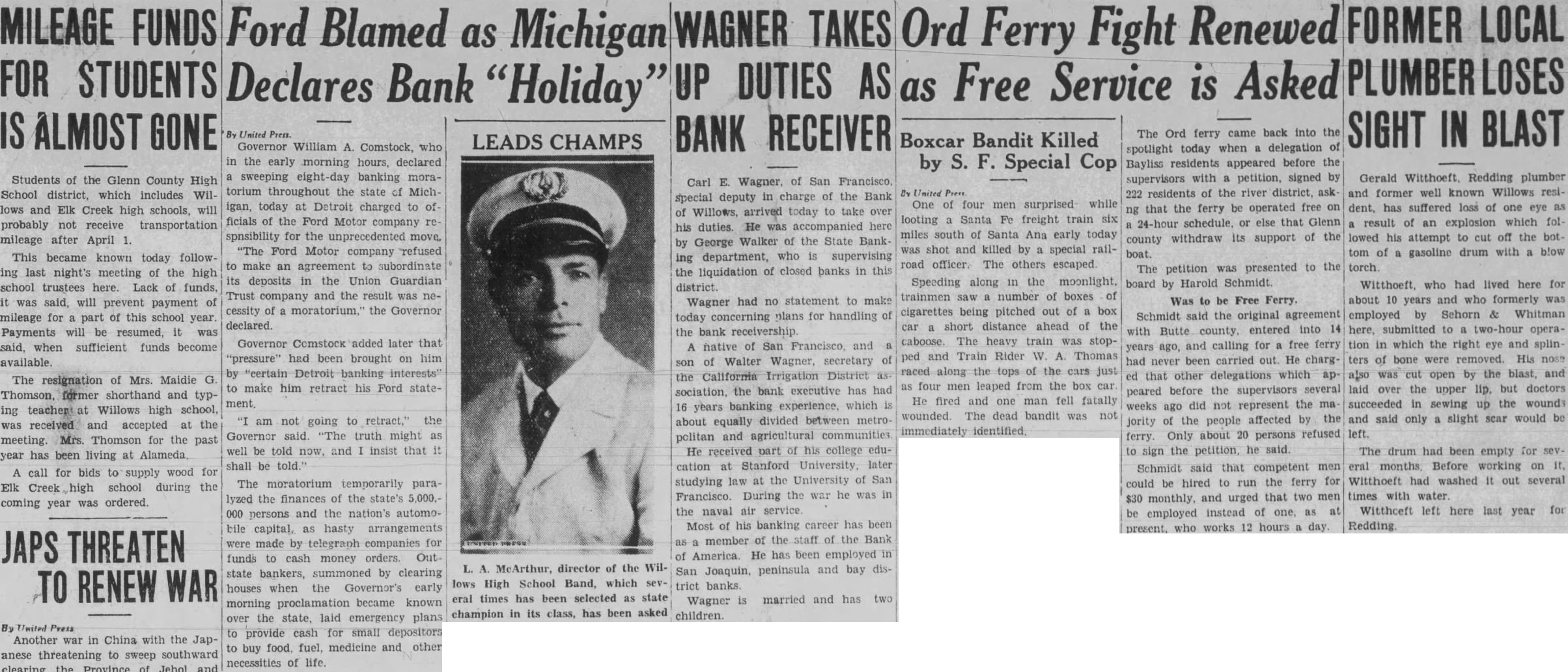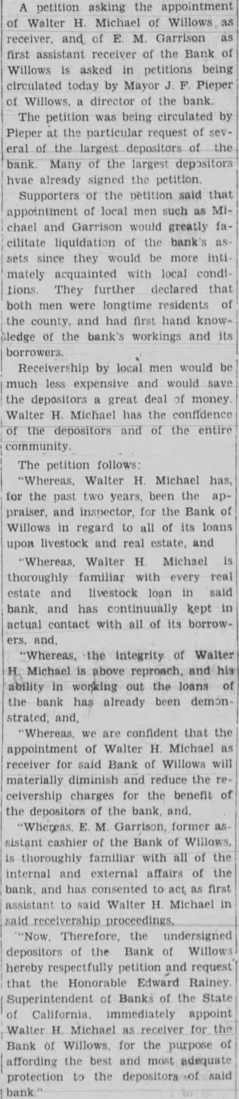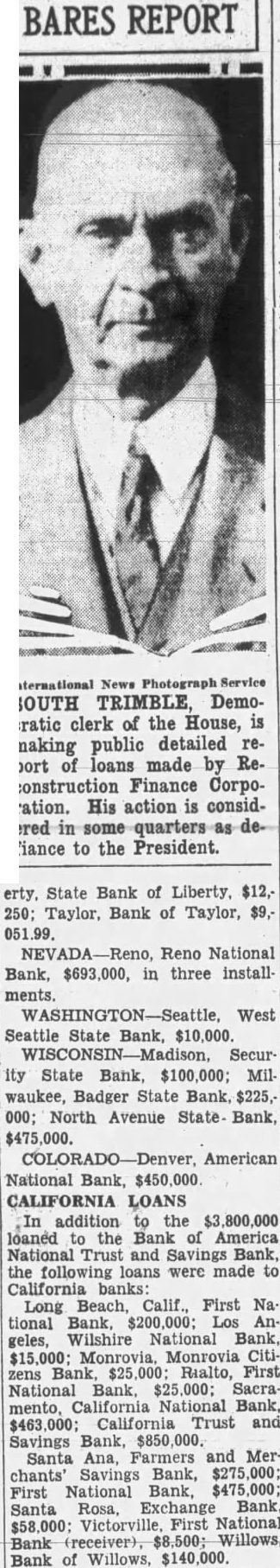 TRIMBLE HITS BACK Official Denies He Sought To Gain Favor With Speaker John Garner During the ten-day period from July to July 31, the reconstruction corporation to banks, and loan ciations, and other agencies. The first report of the corporapublic to-day by South Trimble, of house representatives, accompanied letter signed by Chairman Atlee Pomerene showing that loans totaling $45,057,556 had been made during the ten-day riod and loans thorized prior July 21 had totalled Banks Get Most The letter the total amount loaned, authorized banks and trust companies, including to the closed banks; $104,309 to agriculture credit corporations; $3,088,650 building and loan $2,247,500 $90,000 joint stock land bank; $580,716 livestock credit porations; $747,000 mortgage companies, and $6,862,700 railroads. Trimble in making public the following his decision last Thursday that he had no other choice the law, took exception Representaconferee on the relief bill, that his decision to make public the reports gain favor with Speaker John Garner. Chairman Pomerene's letter said the close the period except $25,000,000 of the $250,000,000, second series 3½ per cent notes authorized by of June 1932, had been sold the secretary of Loans In California The statement of loans authorized California during the tenperiod under section the of interest per includes Long Beach, First National Bank Long Beach, $200,000. Los Angeles, Wilshire National Bank of Los Angelees, Monrovia, Citizens' Bank of MonRialto, First National Bank, $25,- Sacramento, California National Bank of Sacramento, California Trust and Savings Bank, $850,000. Francisco, National Trust and Bank of America, $3,800,000. Santa Ana, Farmers and Merchants Savings Bank of Santa Ana, $275,000. Santa Ana, First National Bank of, Santa Rosa, Exchange Bank, $58,000. Victorville, First National Bank of, (receiver) Willows, Bank of Willows, $140,000.