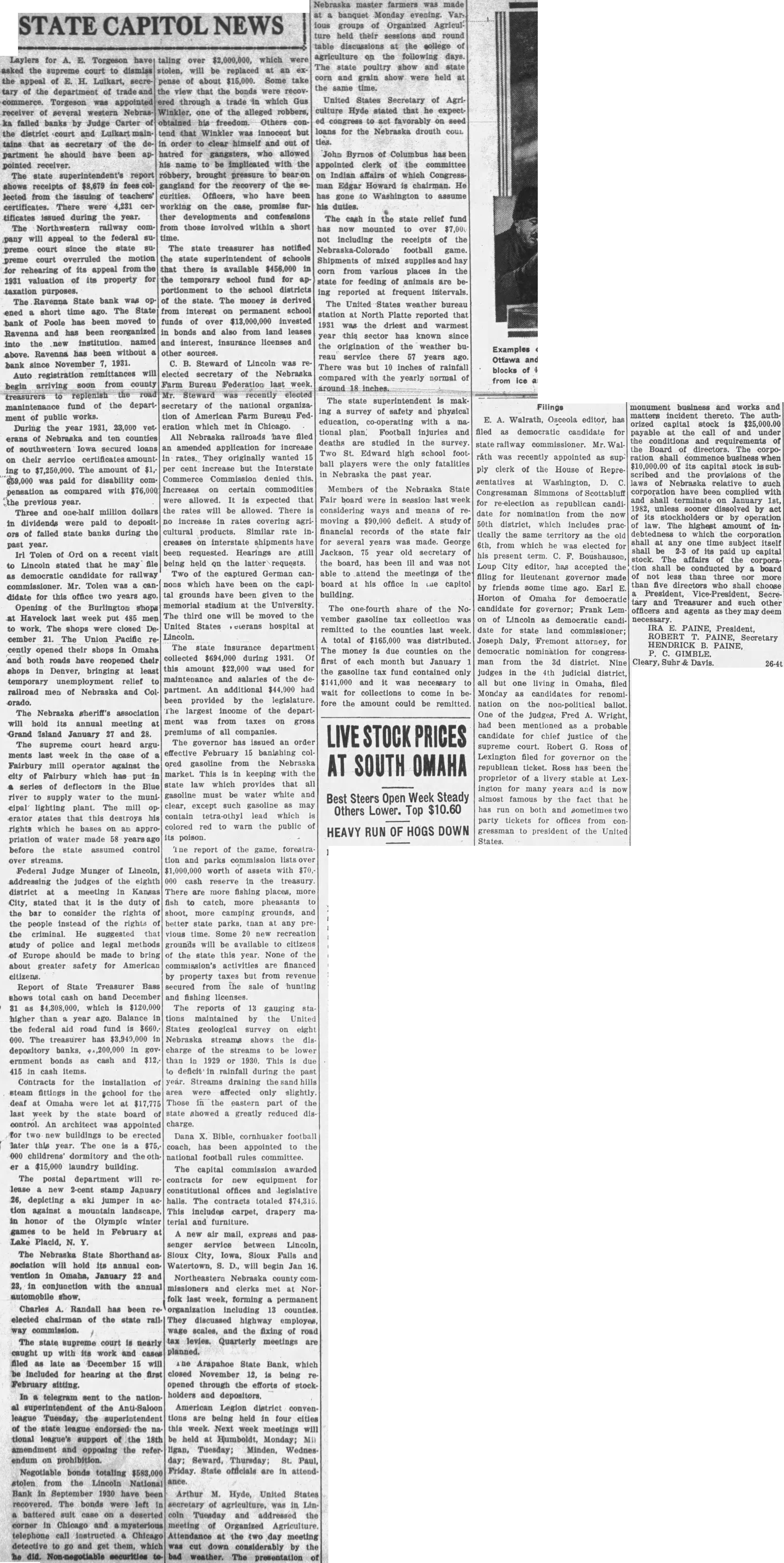 Laylers for Torgeson asked the supreme court to dismiss the appeal of Luikart, secretary of the department of commerce. Torgeson was appointed receiver several western Nebras ka failed banks Judge Carter the district court and tains that as secretary of the partment he should have been pointed receiver. The state superintendent's report shows receipts of $8,679 in lected from the issuing of teachers' certificates. There were 4,231 tificates issued during the year. The Northwestern railway pany will appeal to the federal sucourt since the state preme court overruled the motion preme for of its appeal the rehearing valuation of its property for 1931 taxation purposes. The Ravenna State bank was short time The State ened ago. bank of Poole has been moved Ravenna and has been reorganized institution named into the new above. Ravenna has been without bank since November 1931. Auto registration remittances will soon from county begin arriving treasurers replenish fund of the departmanintenance ment of public works. During the year 1931, 23,000 veterans Nebraska and ten counties of southwestern Iowa secured loans on their service certificates ing to $7,250,000. The amount of $1,was paid for disability compensation compared with $76,000 the previous year. Three and one-half million dollars in dividends were paid to depositof failed state banks during the ors past year. Irl Tolen of Ord on recent visit to Lincoln stated that he may file democratic candidate for railway commissioner. Mr. Tolen was didate for this office two years ago. Opening of the Burlington shops at Havelock last week put 485 men work. The shops were closed December 21. The Union Pacific cently opened their shops in Omaha and both roads have reopened their shops in Denver, bringing at least temporary unemployment relief railroad men of Nebraska and Col- orado.
