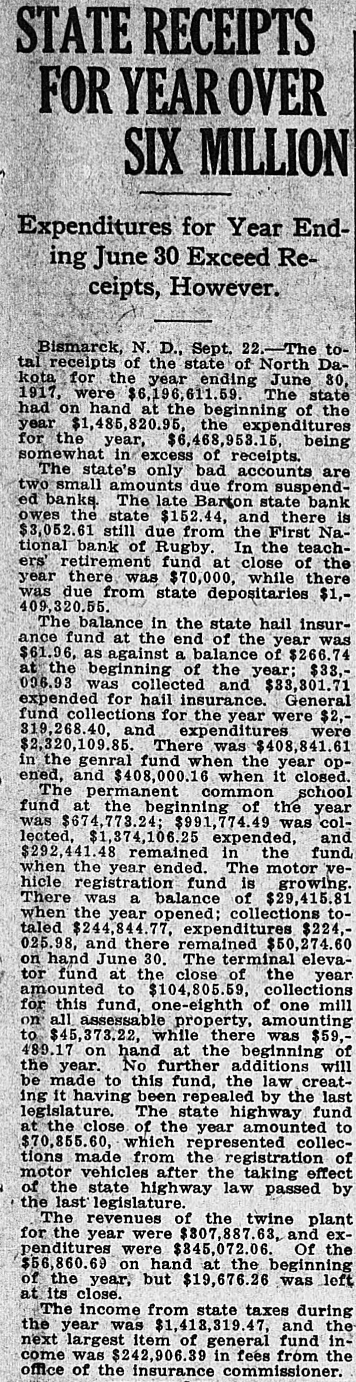 STATE RECEIPTS FOR YEAR OVER SIX MILLION Expenditures for Year Ending June 30 Exceed Receipts, However. Bismarck, N. D., Sept. 22.-The total receipts of the state of North Dakota for the year ending June 30, 1917, were $6,196,611.59. The state had on hand at the beginning of the year $1,485,820.95, the expenditures for the year, $6,468,953.15, being somewhat in excess of receipts. The state's only bad accounts are two small amounts due from suspended banks. The late Barton state bank owes the state $152.44, and there is $3,052.61 still due from the First National bank of Rugby. In the teachers' retirement fund at close of the year there was $70,000, while there was due from state depositaries $1,409,320.55. The balance in the state hail insurance fund at the end of the year was $61.96, as against a balance of $266.74 at the beginning of the year; $33,096.93 was collected and $33,301.71 expended for hail insurance. General fund collections for the year were $2,319,268.40, and expenditures were $2,320,109.85. There was $408,841.61 in the genral fund when the year opened, and $408,000.16 when it closed. The permanent common school fund at the beginning of the year was $674,773.24; $991,774.49 was collected, $1,374,106.25 expended, and $292,441.48 remained in the fund when the year ended. The motor vehicle registration fund is growing. There was a balance of $29,415.81 when the year opened; collections totaled $244,844.77, expenditures $224,025.98, and there remained $50,274.60 on hand June 30. The terminal elevator fund at the close of the year amounted to $104,805.59, collections for this fund, one-eighth of one mill on all assessable property, amounting to $45,373.22, while there was $59,489.17 on hand at the beginning of the year. No further additions will be made to this fund, the law creating it having been repealed by the last legislature. The state highway fund at the close of the year amounted to $70,855.60, which represented collections made from the registration of motor vehicles after the taking effect of the state highway law passed by the last legislature. The revenues of the twine plant for the year were $307,887.63, and expenditures were $845,072.06. Of the $56,860.69 on hand at the beginning of the year, but $19,676.26 was left at its close. The income from state taxes during the year was $1,418,319.47, and the next largest item of general fund income was $242,906.39 in fees from the office of