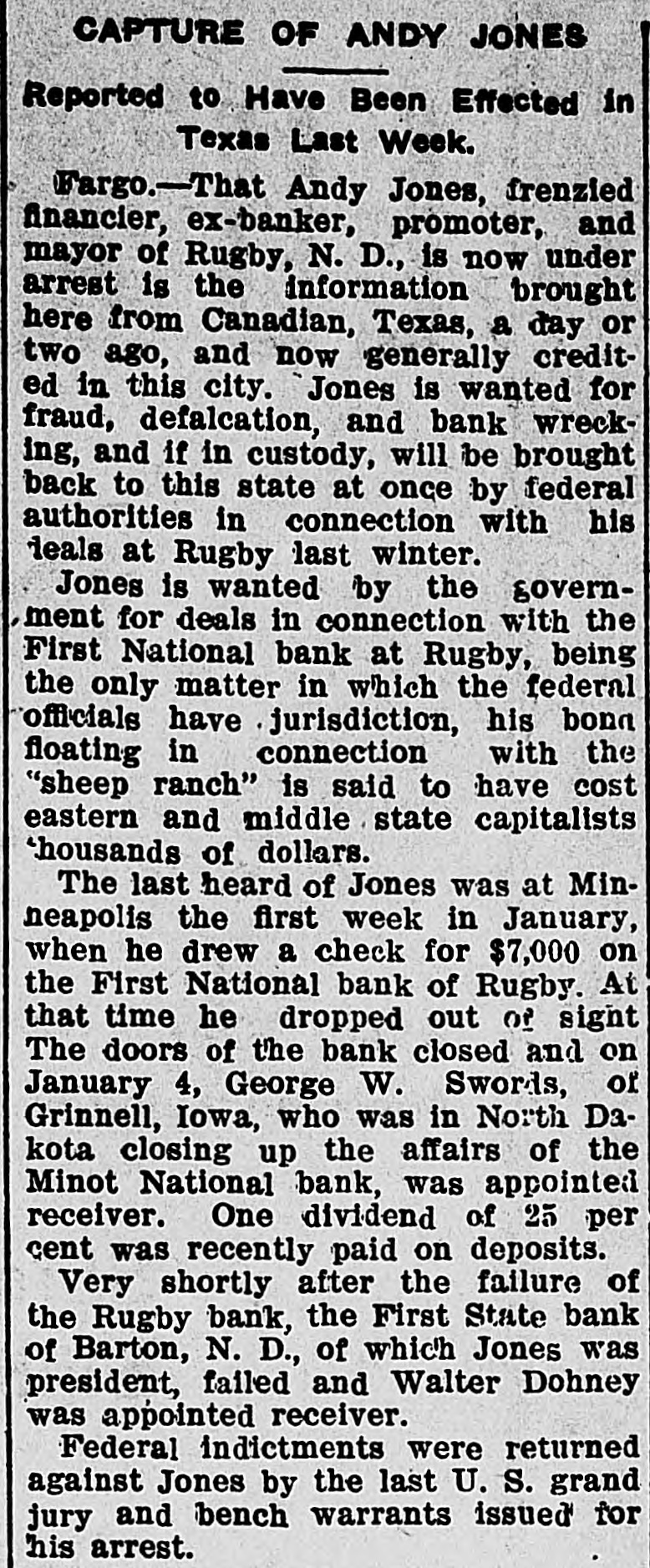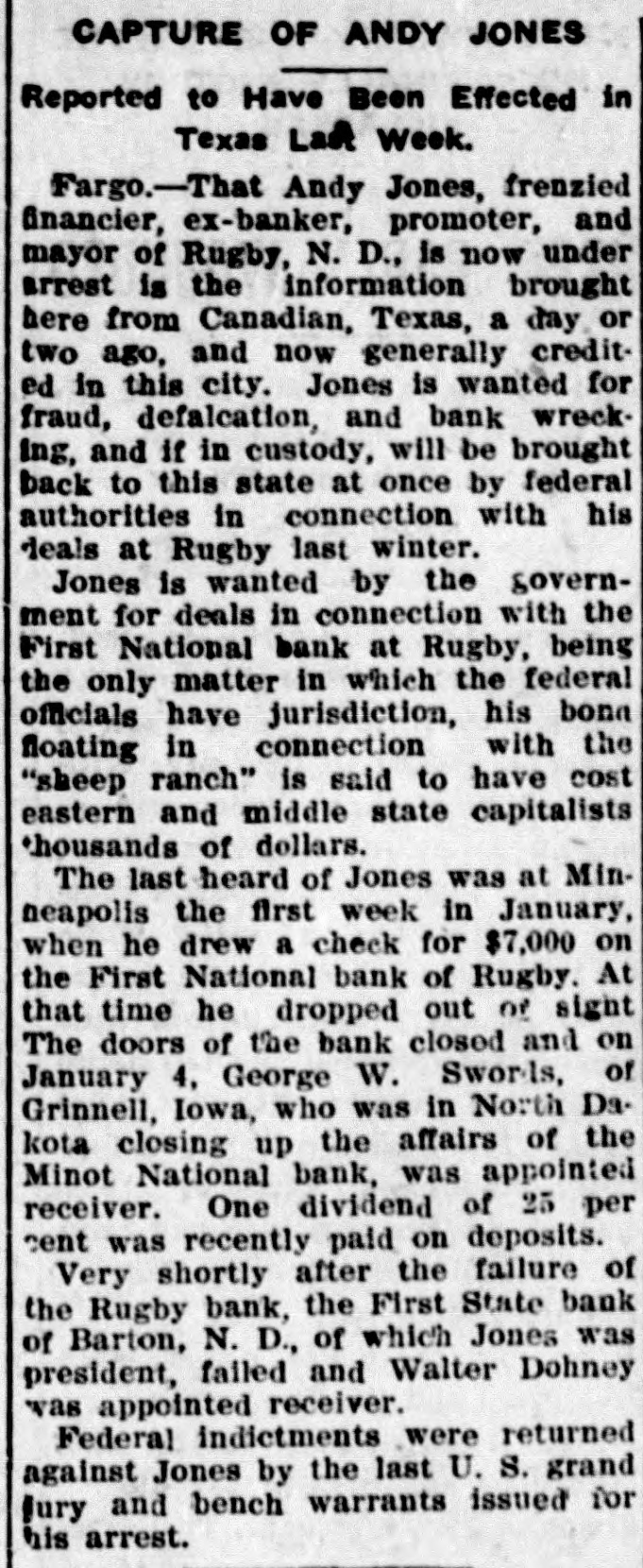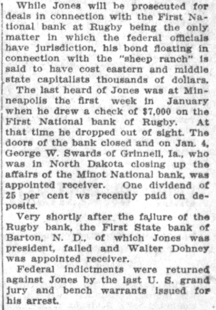 TWO NEW BANKS AT RUGBY. Pierce County to Have at Least Three New Financial Institutions. Grand Foks Herald: As a result of the closing of the First National bank of Rugby and the First State bank of Barton, following the disappearance of Mayor Andy Jones, three new banks are to be started in Pierce county. Certificates of organization have already been filed with the Pierce county register of deeds for the First State bank of Rugby and the State bank of Barton, each with a capital of $10,000. The Ross-Davidson syndicate, owning a string of banks in North Dakota, is back of both. The promoters of the other bank, which will be located in Rugby, are O. T. Tofsrud, president; Ed Seele, vice president, and Nels Romness, cashier. Every train arriving from the east for several days has brought to Rugby Minnesota and Wisconsin bankers who purchased notes from Jones. The exact amount of the notes of doubtful value floated by Jones is not yet known, but estimates run as high as $250,000. Minnesota seems to have been Jones' favorite field of operation and the amount of paper held by capitalists of that state is greater than the combined holdings from all other states, it is asserted. It is confidently believed by those most heavily interested that if the bank is released from the obligation of the supposed worthless notesonly taken into consideration because endorsed by Jones as cashier of the First National bank, but not of record-there will be enough to pay all creditors and depositors in full. The resources of the bank seem to have been left unimpaired with the exception of these questionable obligations. Vice President F. T. Gronvold is one of those belonging to the optimistic class. In his financial dealings Jones did not let the matter of friendship count for anything. Some of his best friends are apt to suffer to the greatest extent. In endorsing the notes which have been declared not binding on the bank Jones used rubber stamps containing the banks endorsement. He stamped the notes on the back when he desired to sell them. The stamp contains no registry number and SO the proceedings have been held irregular by the receiver. No trace of Jones has been secured. His last dealings are believed to have been in St. Paul. H. J. Mushburger, who recently had a public sale, has rented his farm to E. Morgan and will move to Omemee, having purchased the A. A.