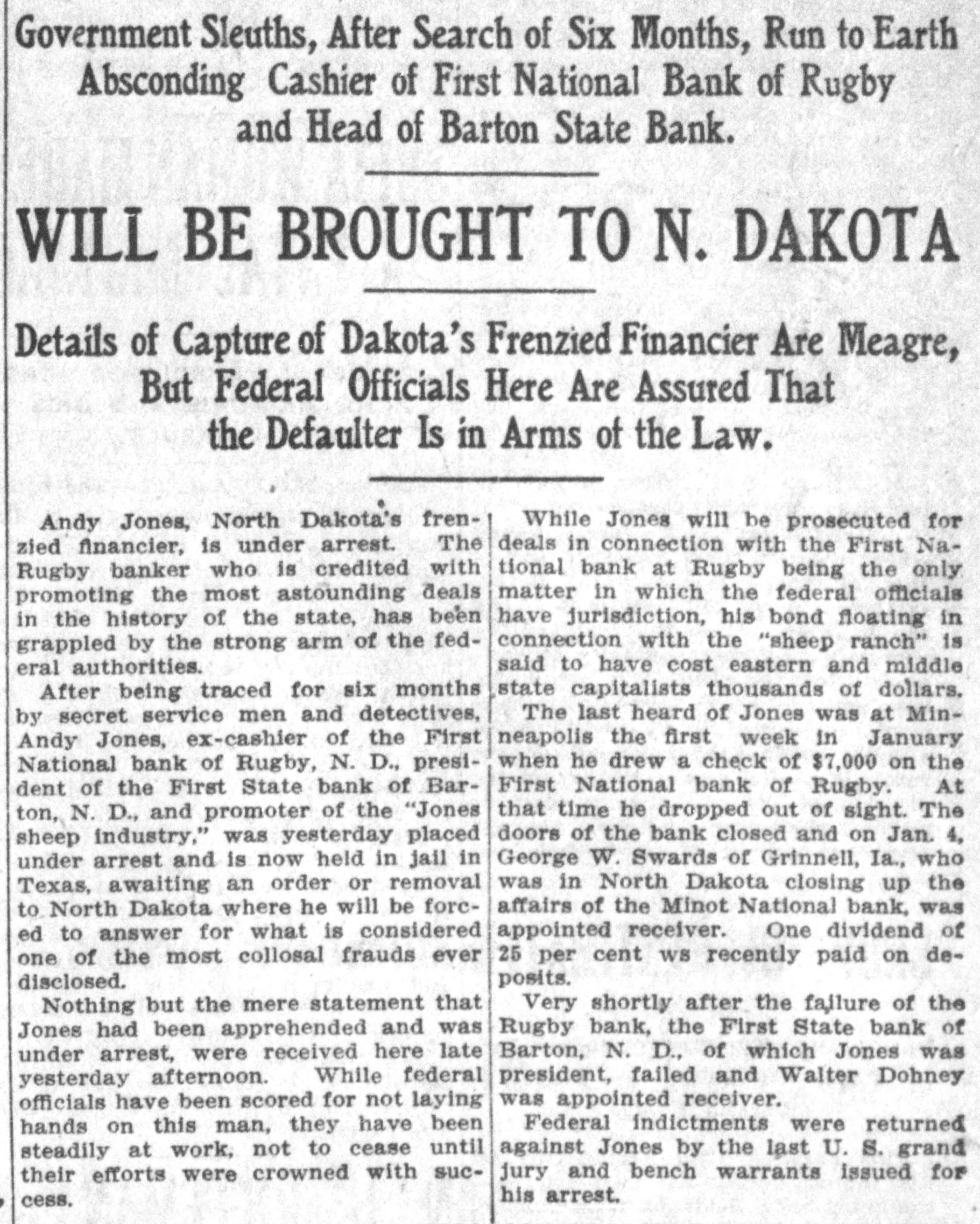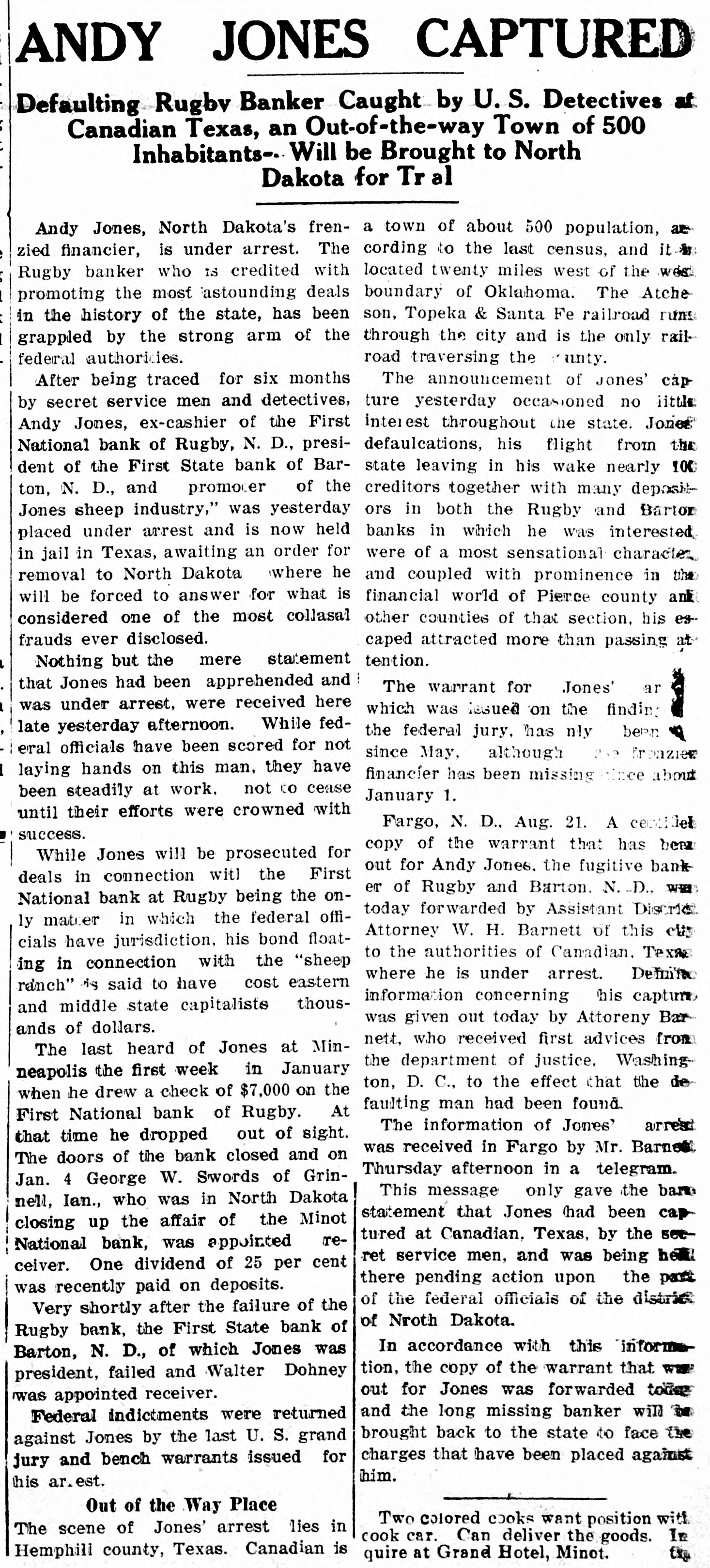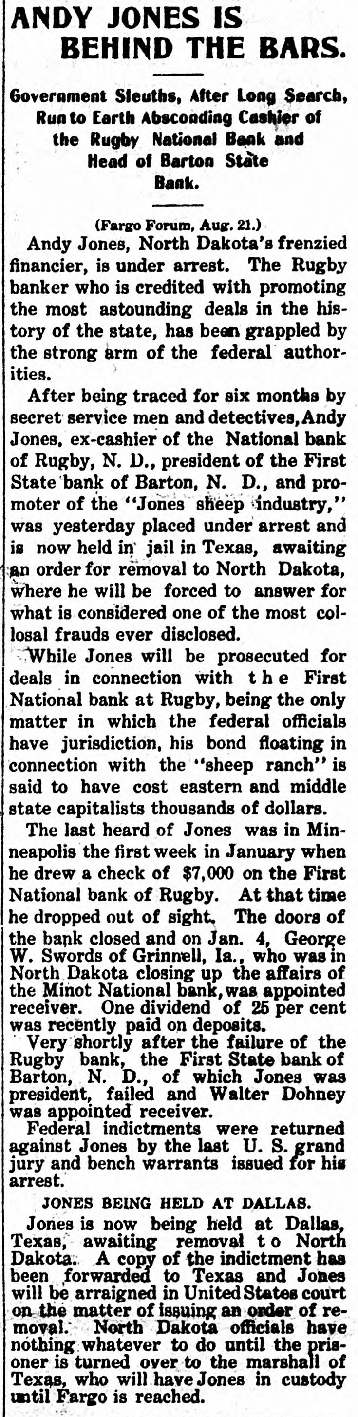 TWO NEW BANKS AT RUGBY. Pierce County to Have at Least Three New Financial Institutions. Grand Foks Herald: As a result of the closing of the First National bank of Rugby and the First State bank of Barton, following the disappearance of Mayor Andy Jones, three new banks are to be started in Pierce county. Certificates of organization have already been filed with the Pierce county register of deeds for the First State bank of Rugby and the State bank of Barton, each with a capital of $10,000. The Ross-Davidson syndicate, owning a string of banks in North Dakota, is back of both. The promoters of the other bank, which will be located in Rugby, are O. T. Tofsrud, president; Ed Seele, vice president, and Nels Romness, cashier. Every train arriving from the east for several days has brought to Rugby Minnesota and Wisconsin bankers who purchased notes from Jones. The exact amount of the notes of doubtful value floated by Jones is not yet known, but estimates run as high as $250,000. Minnesota seems to have been Jones' favorite field of operation and the amount of paper held by capitalists of that state is greater than the combined holdings from all other states, it is asserted. It is confidently believed by those most heavily interested that if the bank is released from the obligation of the supposed worthless notesonly taken into consideration because endorsed by Jones as cashier of the First National bank, but not of record-there will be enough to pay all creditors and depositors in full. The resources of the bank seem to have been left unimpaired with the exception of these questionable obligations. Vice President F. T. Gronvold is one of those belonging to the optimistic class. In his financial dealings Jones did not let the matter of friendship count for anything. Some of his best friends are apt to suffer to the greatest extent. In endorsing the notes which have been declared not binding on the bank Jones used rubber stamps containing the banks endorsement. He stamped the notes on the back when he desired to sell them. The stamp contains no registry number and SO the proceedings have been held irregular by the receiver. No trace of Jones has been secured. His last dealings are believed to have been in St. Paul. H. J. Mushburger, who recently had a public sale, has rented his farm to E. Morgan and will move to Omemee, having purchased the A. A.