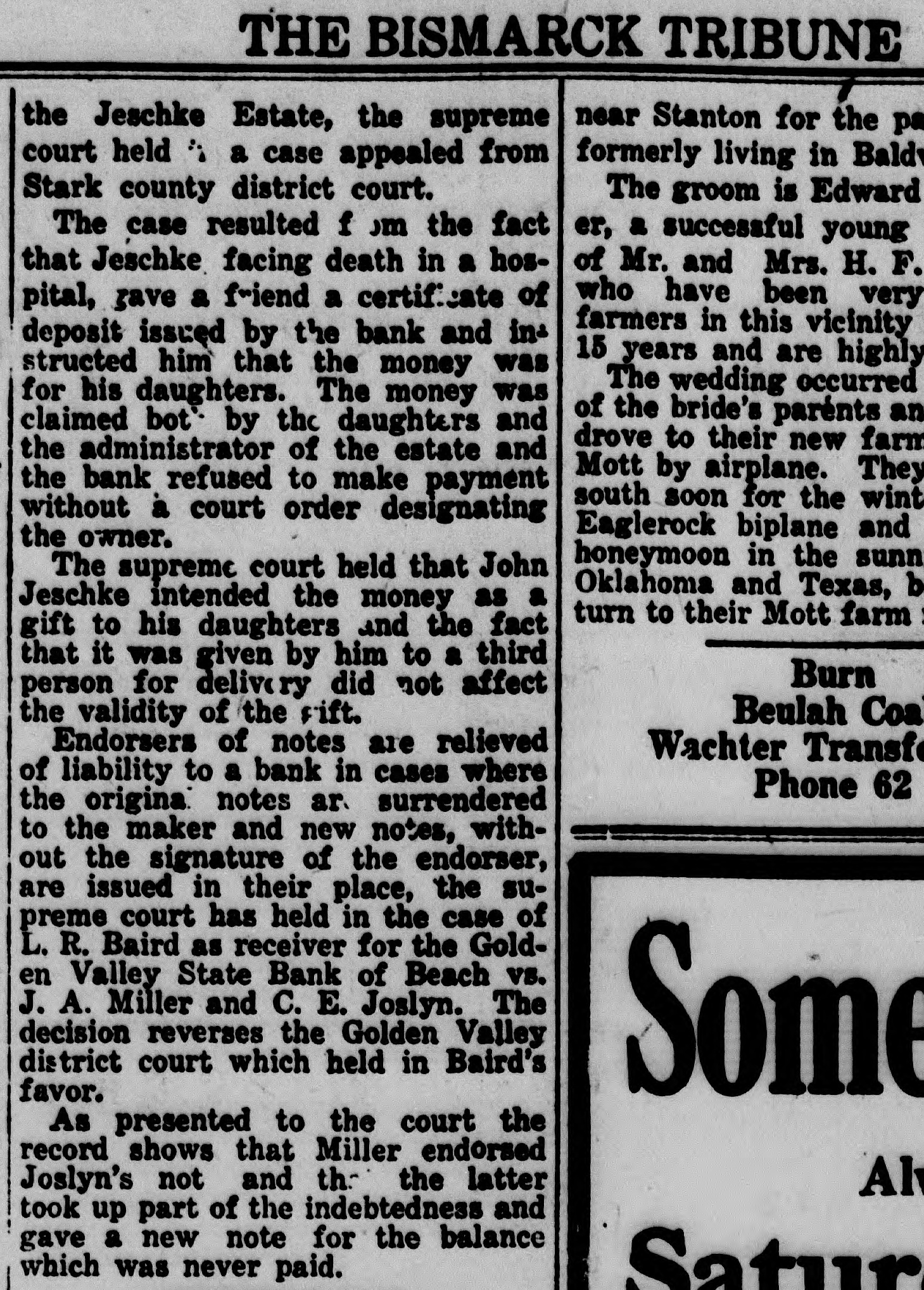 THE BISMARCK TRIBUNE the Jeschke Estate, the supreme near Stanton for the pa court held is a case appealed from formerly living in Bald Stark county district court. The groom is Edward The case resulted f m the fact er, a successful young of Mr. and Mrs. H. F. that Jeschke facing death in a hoswho have been very pital, gave a friend a certificate of farmers in this vicinity deposit issuęd by the bank and in15 years and are highly structed him that the money was The wedding occurred for his daughters. The money was of the bride's parénts an claimed bot'. by the daughters and drove to their new farm the administrator of the estate and Mott by airplane. They the bank refused to make payment south soon for the wint without à court order designating Eaglerock biplane and the owner. honeymoon in the sunn The supreme court held that John Oklahoma and Texas, b Jeschke intended the money as a turn to their Mott farm : gift to his daughters and the fact that it was given by him to a third Burn person for delivery did not affect Beulah Coa the validity of the sift. Endorsers of notes are relieved Wachter Transfer of liability to a bank in cases where Phone 62 the original notes ar. surrendered to the maker and new notes, without the signature of the endorser, are issued in their place, the supreme court has held in the case of L. R. Baird as receiver for the Golden Valley State Bank of Beach vs. J. A. Miller and C. E. Joslyn. The decision reverses the Golden Valley district court which held in Baird's Some favor. As presented to the court the record shows that Miller endorsed Joslyn's not and the the latter Al took up part of the indebtedness and gave a new note for the balance which was never paid. Satur