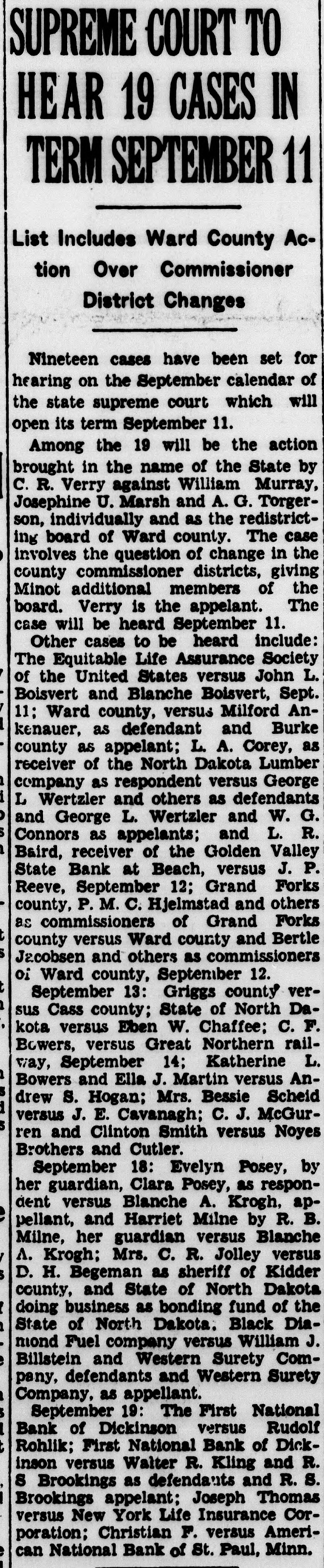 SUPREME COURT IV HEAR 19 CASES IN TERM SEPTEMBER 11 List Includes Ward County Action Over Commissioner District Changes Nineteen cases have been set for hearing on the September calendar of the state supreme court which will open its term September 11. Among the 19 will be the action brought in the name of the State by C. R. Verry against William Murray, Josephine U. Marsh and A. G. Torgerson, individually and as the redistricting board of Ward county. The case involves the question of change in the county commissioner districts, giving Minot additional members of the board. Verry is the appelant. The case will be heard September 11. Other cases to be heard include: The Equitable Life Assurance Society of the United States versus John L. Boisvert and Blanche Boisvert, Sept. 11; Ward county, versus Milford Ankenauer, as defendant and Burke county as appelant; L. A. Corey, as receiver of the North Dakota Lumber company as respondent versus George L Wertzler and others as defendants and George L. Wertzler and W. G. Connors as appelants; and L. R. Baird, receiver of the Golden Valley State Bank at Beach, versus J. P. Reeve, September 12; Grand Forks county, P. M. C. Hjelmstad and others as commissioners of Grand Forks county versus Ward county and Bertle Jacobsen and others as commissioners oi Ward county, September 12. September 13: Griggs county versus Cass county; State of North Dakota versus Eben W. Chaffee; C. F. Bowers, versus Great Northern railway, September 14; Katherine L. Bowers and Ella J. Martin versus Andrew S. Hogan; Mrs. Bessie Scheid versus J. E. Cavanagh; C. J. McGurren and Clinton Smith versus Noyes Brothers and Cutler. September 18: Evelyn Posey, by her guardian, Clara Posey, as respondent versus Blanche A. Krogh, appellant, and Harriet Milne by R. B. Milne, her guardian versus Blanche A. Krogh; Mrs. C. R. Jolley versus D. H. Begeman as sheriff of Kidder county, and State of North Dakota doing business as bonding fund of the State of North Dakota. Black Diamond Fuel company versus William J. Billstein and Western Surety Company, defendants and Western Surety Company, as appellant. September 19: The First National Bank of Dickinson versus Rudolf Rohlik; First National Bank of Dickinson versus Walter R. Kling and R. S Brookings as defendants and R. S. Brookings appelant; Joseph Thomas versus New York Life Insurance Corporation; Christian F. versus American National Bank of St. Paul, Minn.
