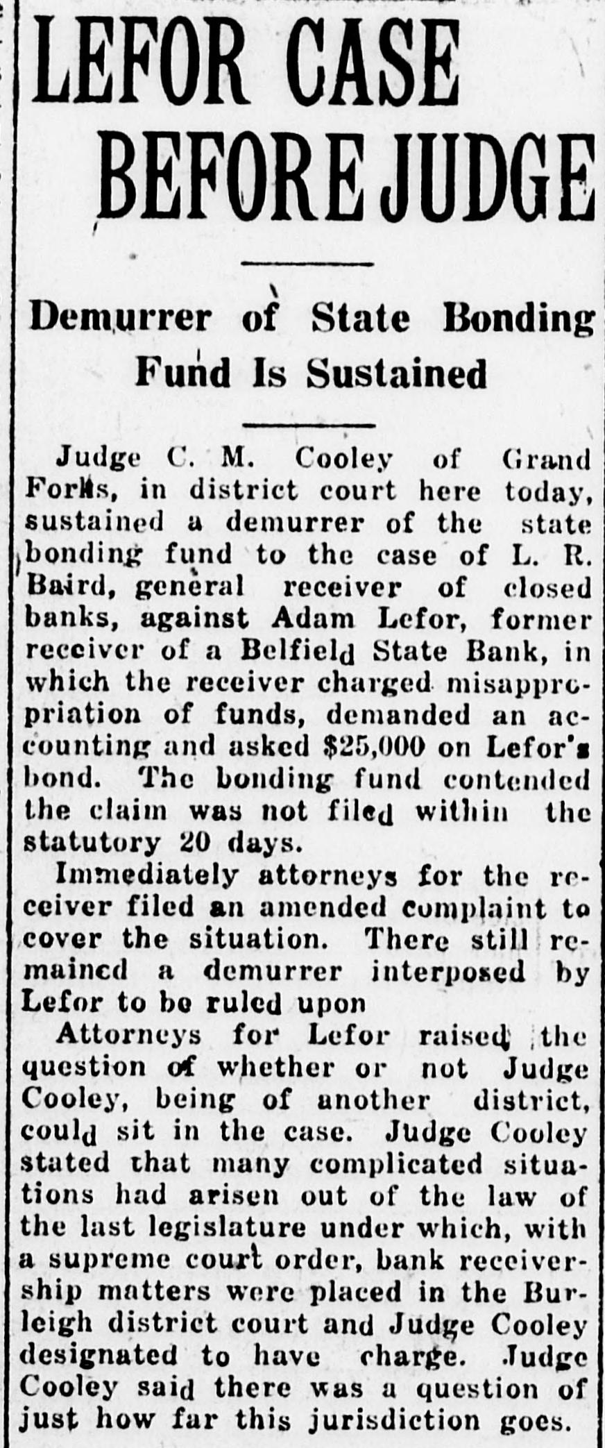 LEFOR CASE BEFORE JUDGE Demurrer of State Bonding Fund Is Sustained Judge C. M. Cooley of Grand Forks, in district court here today, sustained a demurrer of the state bonding fund to the case of L. R. Baird, general receiver of closed banks, against Adam Lefor, former receiver of a Belfield State Bank, in which the receiver charged misapprcpriation of funds, demanded an accounting and asked $25,000 on Lefor's bond. The bonding fund contended the claim was not filed within the statutory 20 days. Immediately attorneys for the receiver filed an amended complaint to cover the situation. There still remained a demurrer interposed by Lefor to be ruled upon Attorneys for Lefor raised the question of whether or not Judge Cooley, being of another district, could sit in the case. Judge Cooley stated that many complicated situations had arisen out of the law of the last legislature under which, with a supreme court order, bank receivership matters were placed in the Burleigh district court and Judge Cooley designated to have charge. Judge Cooley said there was a question of just how far this jurisdiction goes.