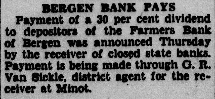 BERGEN BANK PAYS Payment of a 30 per cent dividend to depositors of the Farmers Bank of Bergen was announced Thursday by the receiver of closed state banks. Payment is being made through G. R. Van Sickle, district agent for the rcceiver at Minot.