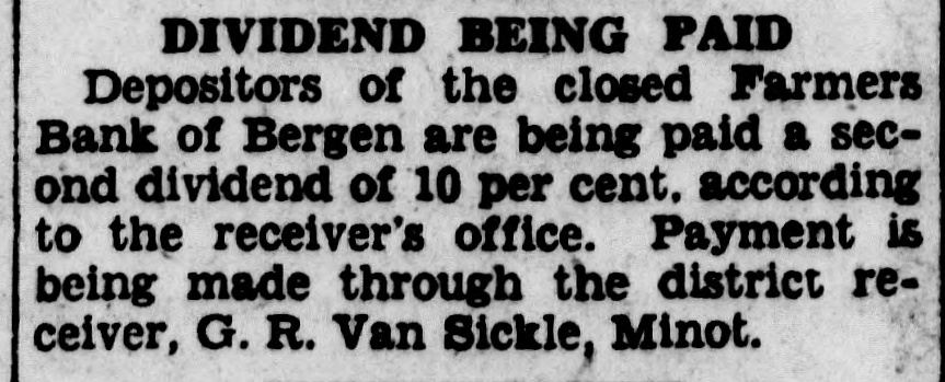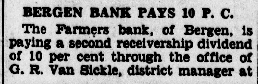 BERGEN BANK PAYS 10 P. C. The Farmers bank, of Bergen, is paying a second receivership dividend of 10 per cent through the office of G.R. Van Sickle, district manager at