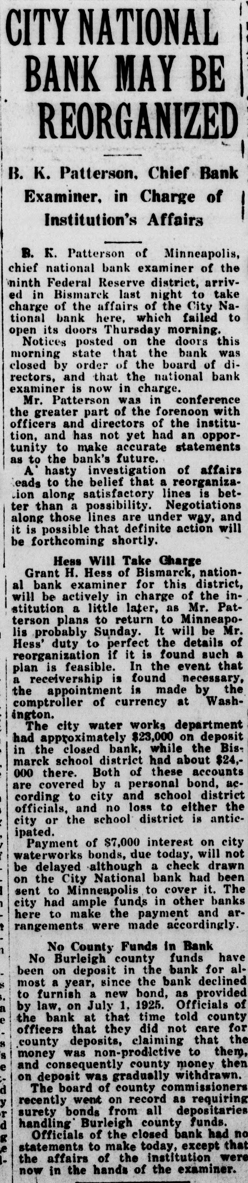 CITY NATIONAL BANK MAY BE REORGANIZED B. K. Patterson. Chief Bank Examiner. in Charge of Institution's Affairs R. K. Patterson of Minneapolis, chief national bank examiner of the ninth Federal Reserve district, arrived in Bismarck last night to take charge of the affairs of the City National bank here, which failed to open its doors Thursday morning. Notices posted on the doors this morning state that the bank was closed by order of the board of directors, and that the national bank examiner is now in charge. Mr. Patterson was in conference the greater part of the forenoon with officers and directors of the institution, and has not yet had an opportunity to make accurate statements as to the bank's future. A' hasty investigation of affairs leads to the belief that a reorganizaion along satisfactory lines is better than a possibility. Negotiations along those lines are under way, and it is possible that definite action will be forthcoming shortly. Hess Will Take Charge Grant H. Hess of Bismarck, national bank examiner for this district, will be actively in charge of the institution a little later, as Mr. Patterson plans to return to Minneapolis probably Sunday. It will be Mr. Hess' duty to perfect the details of reorganization if it is found such a plan is feasible. In the event that a receivership is found necessary, the appointment is made by the comptroller of currency at Washington. The city water works department had approximately $23,000 on deposit in the closed bank, while the Bismarck school district had about $24,000 there. Both of these accounts are covered by a personal bond, according to city and school district officials, and no loss to either the city or the school district is anticipated. Payment of $7,000 interest on city waterworks bonds, due today, will not be delayed although a check drawn on the City National bank had been sent to Minneapolis to cover it. The city had ample funds in other banks here to make the payment and arrangements were made accordingly. No County Funds in Bank No Burleigh county funds have been on deposit in the bank for almost a year, since the bank declined < to furnish a new bond, as provided by law, on July 1. 1925. Officials of a the bank at that time told county e officers that they did not care for county deposits, claiming that the 8 money was non-productive to them, S and consequently county money then e on deposit was gradually withdrawn. The board of county commissioners recently went on record as requiring surety bonds from all depositaries handling Burleigh county funds. Officials of the closed bank had no statements to make today, except that the affairs of the institution were now in the hands of the examiner.