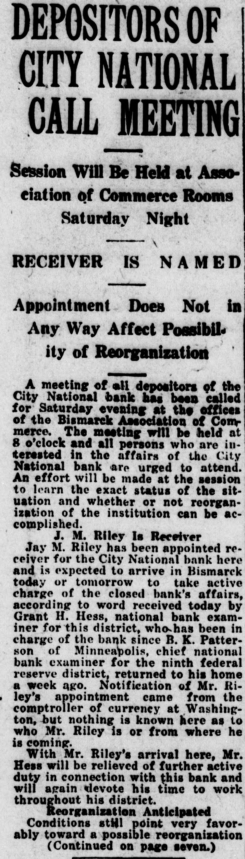DEPOSITORS OF CITY NATIONAL CALL MEETING Session Will Be Held at Association of Commerce Rooms Saturday Night RECEIVER IS NAMED Appointment Does Not in Any Way Affect Possibil. ity of Reorganization A meeting of all depositors of the City National bank has been called for Saturday evening at the offices of the Bismarck Association of Com merce. The meeting will be held at 8 o'clock and all persons who are interested in the affairs of the City National bank are urged to attend. An effort will be made at the session to learn the exact status of the situation and whether or not reorganization of the institution can be accomplished. J. M. Riley Is Receiver Jay M. Riley has been appointed receiver for the City National bank here and is expected to arrive in Bismarck today or tomorrow to take active charge of the closed bank's affairs, according to word received today by Grant H. Hess, national bank examiner for this district, who has been in charge of the bank since B. K. Patterson of Minneapolis, chief national bank examiner for the ninth federal reserve district, returned to his home a week ago. Notification of Mr. Riley's appointment came from the comptroller of currency at Washington, but nothing is known here as to who Mr. Riley is or from where he is coming. With Mr. Riley's arrival here, Mr. Hess will be relieved of further active duty in connection with this bank and will again devote his time to work throughout his district. Reorganization Anticipated Conditions still point very favorably toward a possible reorganization (Continued on page seven.)