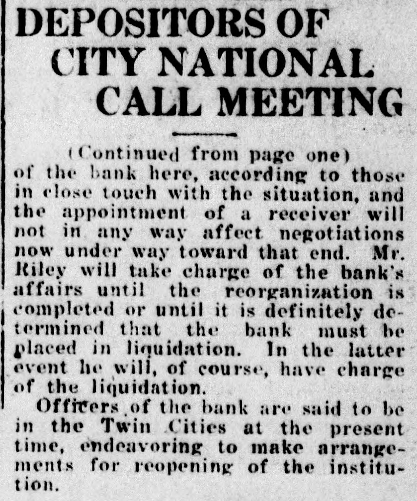DEPOSITORS OF CITY NATIONAL CALL MEETING | Continued from page one) of the bank here, according to those in close touch with the situation, and the appointment of a receiver will not in any way affect negotiations now under way toward that end. Mr. Riley will take charge of the bank's affairs until the reorganization is completed or until it is definitely determined that the bank must be placed in liquidation. In the latter event he will, of course, have charge of the liquidation. Officers of the bank are said to be in the Twin Cities at the present time, endeavoring to make arrangements for reopening of the institution.