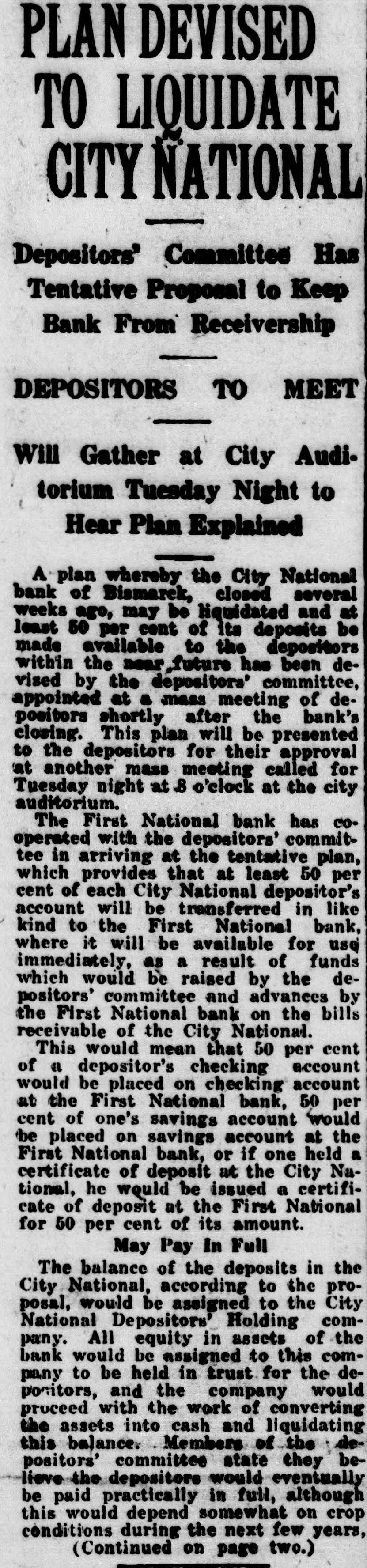 PLAN DEVISED TO LIQUIDATE CITY NATIONAL Depositors' Committee Has Tentative Proposal to Keep Bank From Receivership DEPOSITORS TO MEET Will Gather at City Auditorium Tuesday Night to Hear Plan Explained A plan whereby the City National bank of Bismarck, closed several weeks ago, may be liquidated and at least 50 per cent of its deposits be made available to the depositors within the near,future has been devised by the depositors' committee, appointed at a mass meeting of depositors shortly after the bank's closing. This plan will be presented to the depositors for their approval at another mass meeting called for Tuesday night at .8 o'clock at the city auditorium. The First National bank has cooperated with the depositors' committee in arriving at the tentative plan, which provides that at least 50 per cent of each City National depositor's account will be transferred in like kind to the First National bank, where it will be available for use immediately, as a result of funds which would be raised by the depositors' committee and advances by the First National bank on the bills receivable of the City National. This would mean that 50 per cent of a depositor's checking account would be placed on checking account at the First National bank, 50 per cent of one's savings account would be placed on savings account at the First National bank, or if one held a certificate of deposit at the City National, he would be issued a certificate of deposit at the First National for 50 per cent of its amount. May Pay In Full The balance of the deposits in the City National, according to the proposal, would be assigned to the City National Depositors' Holding company. All equity in assets of the would be assigned to this comto be held in and the company bank pany positors, work trust of for converting the would deproceed with the the assets into cash and liquidating this balance. Members of the depositors' committee state they believe the depositors would eventually be paid practically in full, although this would depend somewhat on crop conditions during the next few years, (Continued on page two.)