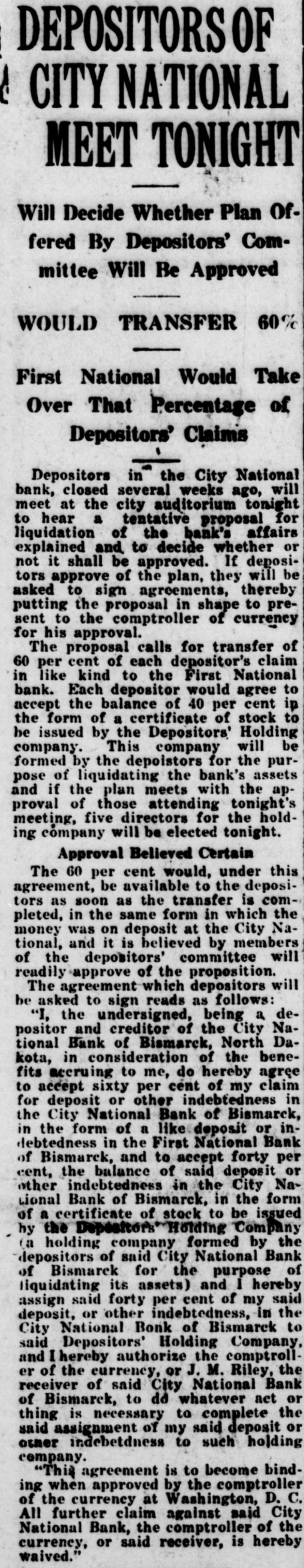 DEPOSITORSOF A CITY NATIONAL MEET TONIGHT Will Decide Whether Plan Offered By Depositors' Committee Will Be Approved WOULD TRANSFER 60% First National Would Take Over That Percentage of Depositors' Claims Depositors in the City National bank, closed several weeks ago, will meet at the city auditorium tonight to hear a tentative proposal for liquidation of the bank's affairs explained and to decide whether or not it shall be approved. If depositors approve of the plan, they will be asked to sign agreements, thereby putting the proposal in shape to present to the comptroller of currency for his approval. The proposal calls for transfer of 60 per cent of each depositor's claim in like kind to the First National bank. Each depositor would agree to accept the balance of 40 per cent in the form of a certificate of stock to be issued by the Depositors' Holding company. This company will be formed by the depoistors for the purpose of liquidating the bank's assets and if the plan meets with the approval of those attending tonight's meeting, five directors for the holding company will be elected tonight. Approval Believed Certain The 60 per cent would, under this agreement, be available to the depositors as soon as the transfer is completed, in the same form in which the money was on deposit at the City National, and it is believed by members of the depositors' committee will readily of approve the proposition. The which depositors will be reads as asked agreement to sign being follows: "I, the undersigned, a depositor and creditor of the City National Bank of Bismarck, North Dakota, in consideration of the benefits accruing to me, do hereby agree to accept sixty per cent of my claim for deposit or other indebtedness in the City National Bank of Bismarck, in the form of a like deposit or indebtedness in the First National Bank of Bismarck, and to accept forty per cent, the balance of said deposit or other indebtedness in the City National Bank of Bismarck, in the form of a certificate of stock to be issued hy the Depositors Holding Company (a holding company formed by the depositors of said City National Bank of Bismarck for the purpose of liquidating its assets) and I hereby assign said forty per cent of my said deposit, or other indebtedness, in the City National Bonk of Bismarck to said Depositors' Holding Company, and Ihereby authorize the comptroll er of the currency, or J. M. Riley, the receiver of said City National Bank of Bismarck, to dd whatever act or thing is necessary to complete the said assignment of my said deposit or other indebetdness to such holding company. is to "This agreement the become comptroller binding when approved by of the currency at Washington, D. C. All further claim against said City National Bank, the comptroller of the currency, or said receiver, is hereby waived."