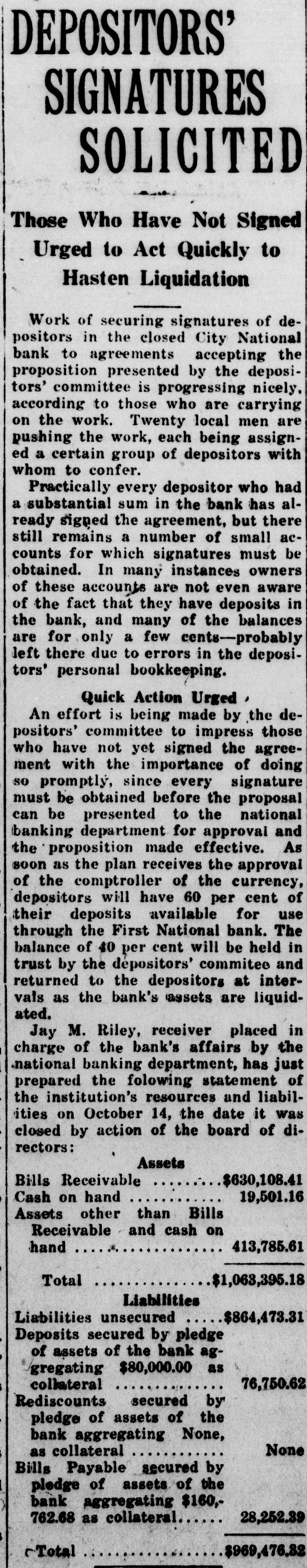 DEPOSITORS' SIGNATURES SOLICITED Those Who Have Not Signed Urged to Act Quickly to Hasten Liquidation Work of securing signatures of depositors in the closed City National bank to agreements accepting the proposition presented by the depositors' committee is progressing nicely, according to those who are carrying on the work. Twenty local men are pushing the work, each being assigned a certain group of depositors with whom to confer. Practically every depositor who had a substantial sum in the bank has already signed the agreement, but there a acwhich In owners counts obtained. still these remains for accounts many number signatures instances not of small must be of are even aware of the fact that they have deposits in the bank, and many of the balances are for only a few cents-probably left there due to errors in the depositors' personal bookkeeping. Quick Action Urged , An effort is being made by the depositors' committee to impress those who have not yet signed the agreement with the importance of doing so promptly, since every signature must be obtained before the proposal can be presented to the national banking department for approval and the made soon as the of currency, will per depositors the proposition comptroller plan have receives of 60 effective. the the approval cent As of their use the First balance of 40 cent the through trust by deposits depositors' per available National will commitee be bank. for held The and in returned to the depositors at intervals as the bank's assets are liquidated. Jay M. Riley, receiver placed in charge of the bank's affairs by the national banking department, has just prepared the folowing statement of the institution's resources and liabilities on October 14, the date it was closed by action of the board of directors: Assets $630,108.41 Bills Receivable 19,501.16 Cash on hand Assets other than Bills Receivable and cash on hand 413,785.61 Total $1,063,395.18 Liabilities $864,473.31 Liabilities unsecured Deposits secured by pledge of assets of the bank aggregating $80,000.00 as collateral 76,750.62 Rediscounts secured by pledge of assets of the bank aggregating None, None as collateral Bills Payable secured by pledge of assets of the bank aggregating $160,28,252.39 762.68 as collateral Total $969,476.32