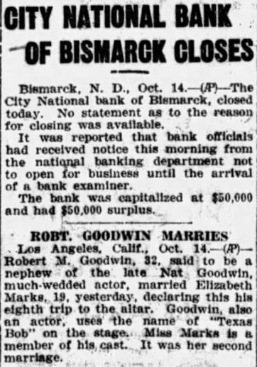 Bismarck, D., Oct. City National bank of closed today No statement as to the reason for closing available. was reported that bank officials had received notice morning from banking open business until the arrival The capitalized at $50,000 and had surplus.