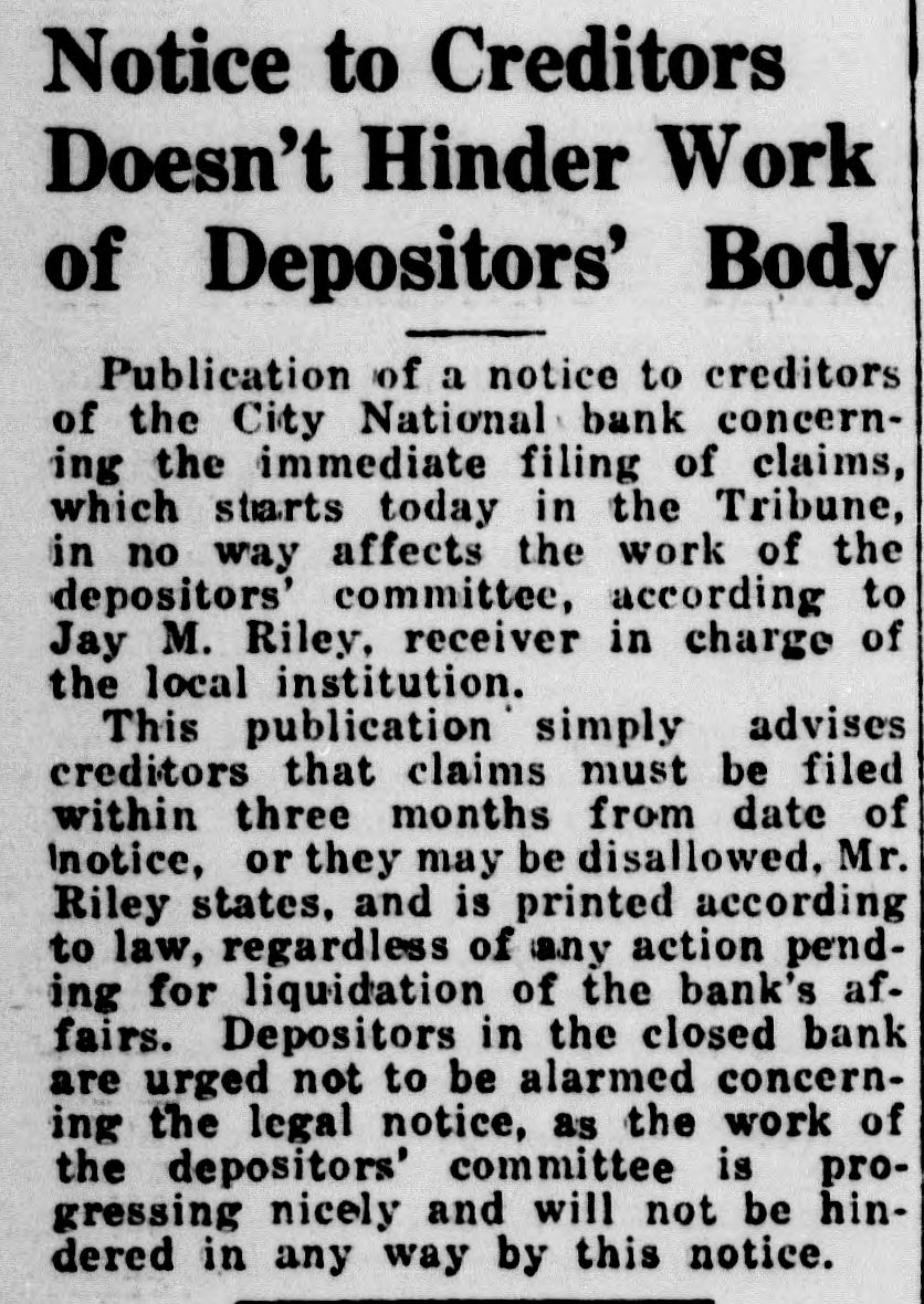 Notice to Creditors Doesn't Hinder Work of Depositors' Body Publication of a notice to creditors of the City National bank concerning the immediate filing of claims, which starts today in the Tribune, in no way affects the work of the depositors' committee, according to Jay M. Riley, receiver in charge of the local institution. This publication simply advises creditors that claims must be filed within three months from date of Inotice, or they may be disallowed. Mr. Riley states, and is printed according to law, regardless of any action pending for liquidation of the bank's affairs. Depositors in the closed bank are urged not to be alarmed concerning the legal notice, as the work of the depositors' committee is progressing nicely and will not be hindered in any way by this notice.