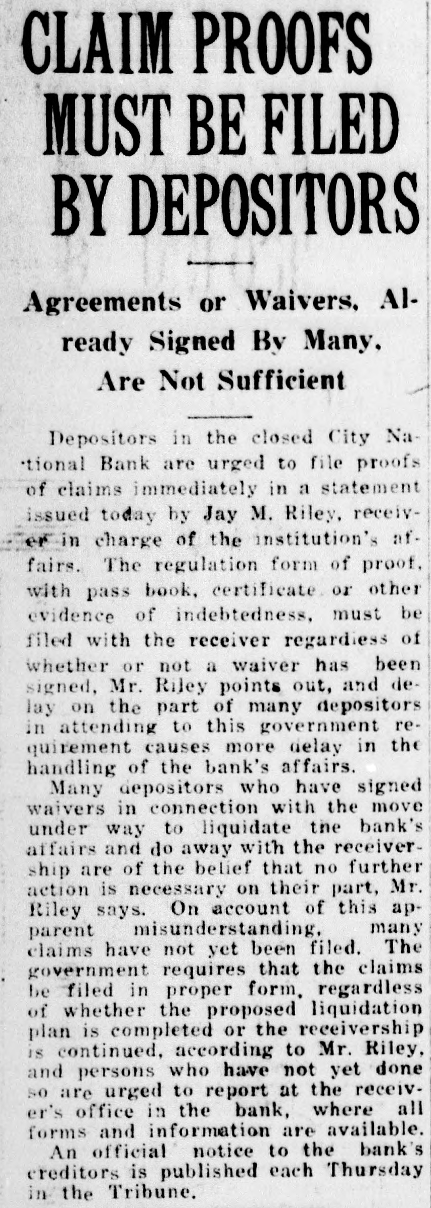 CLAIM PROOFS MUST BE FILED BY DEPOSITORS Agreements or Waivers, Already Signed By Many, Are Not Sufficient Depositors in the closed City National Bank are urged to file proofs of claims immediately in a statement issued today by Jay M. Riley, receiver in charge of the institution's affairs. The regulation form of proof, with pass book, certificate or other evidence of indebtedness, must be filed with the receiver regardiess of whether or not a waiver has been signed, Mr. Riley points out, and delay on the part of many depositors in attending to this government requirement causes more delay in the handling of the bank's affairs. Many depositors who have signed waivers in connection with the move under way to liquidate the bank's affairs and do away with the receivership are of the belief that no further action is necessary on their part, Mr. Riley says. On account of this apparent misunderstanding, many claims have not yet been filed. The government requires that the claims be filed in proper form, regardless of whether the proposed liquidation plan is completed or the receivership is continued, according to Mr. Riley, and persons who have not yet done so are urged to report at the receiver's office in the bank, where all forms and information are available. An official notice to the bank's creditors is published each Thursday in the Tribune.