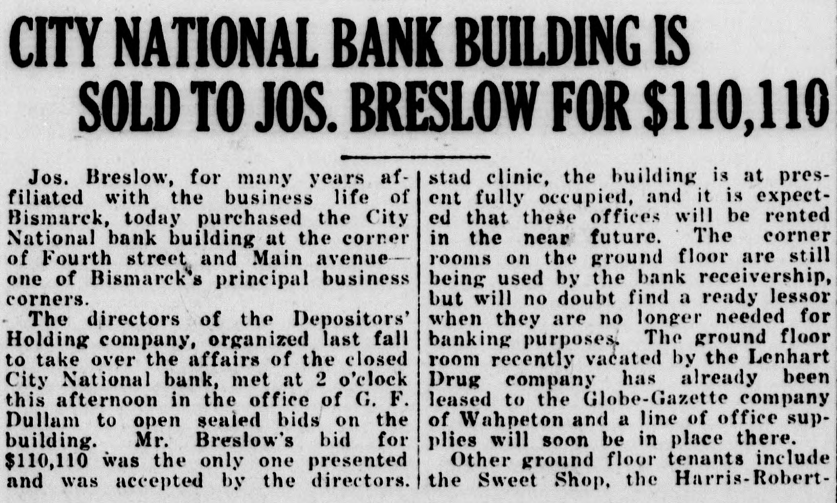CITY NATIONAL BANK BUILDING IS SOLD TO JOS. BRESLOW FOR $110,110 stad clinic, the building is at presJos. Breslow, for many years affiliated with the business life of ent fully occupied, and it is expected that these offices will be rented Bismarck, today purchased the City in the near future. The corner National bank building at the corner of Fourth street and Main avenuerooms on the ground floor are still being used by the bank receivership, one of Bismarck's principal business corners. but will no doubt find a ready lessor The directors of the Depositors' when they are no longer needed for banking purposes. The ground floor Holding company, organized last fall to take over the affairs of the closed room recently vačated by the Lenhart Drug company has already been City National bank, met at 2 o'clock this afternoon in the office of G. F. leased to the Globe-Gazette company Dullam to open sealed bids on the of Wahpeton and a line of office supplies will soon be in place there. building. Mr. Breslow's bid for Other ground floor tenants include $110,110 was the only one presented the Sweet Shop, the Harris-Robertand was accepted by the directors.