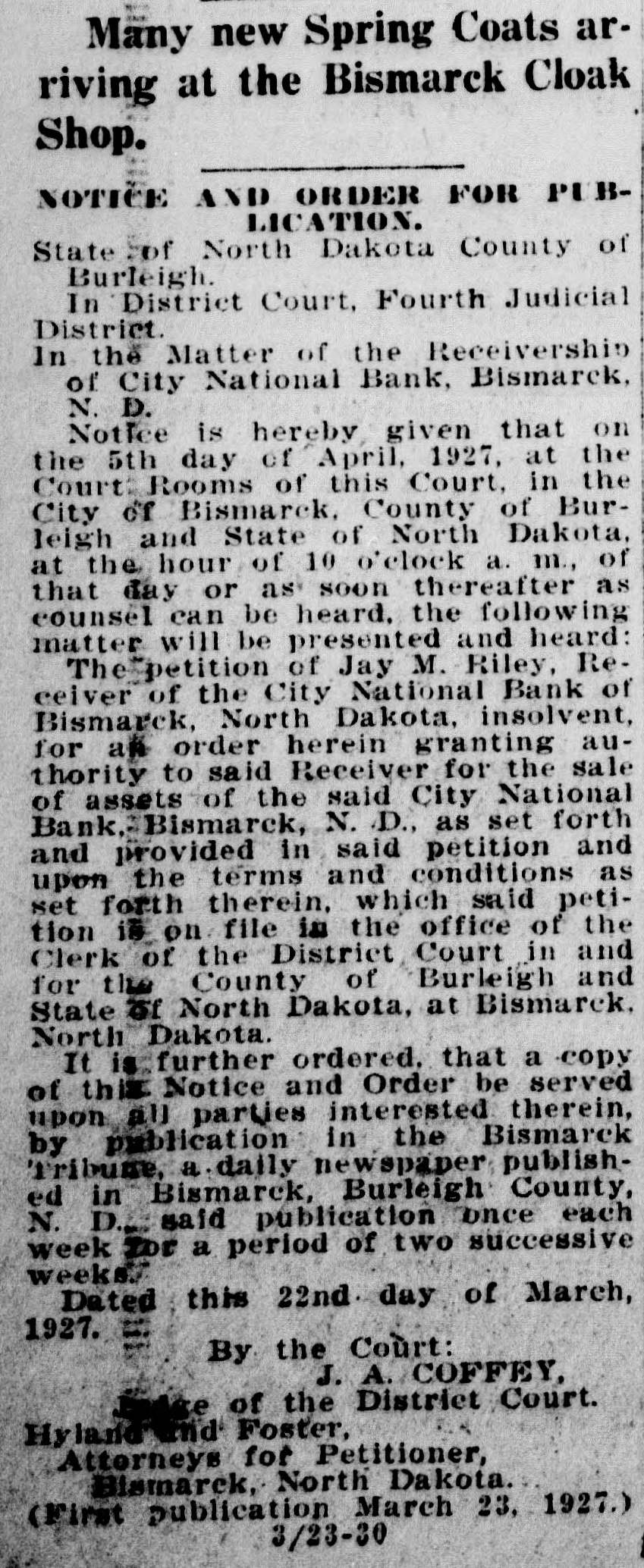 Many new Spring Coats arriving at the Bismarck Cloak Shop. NOTICE AND ORDER FOR PUBLICATION. State :of North Dakota County of Burleigh. In District Court, Fourth Judicial District. In the Matter of the Receivership of City National Bank, Bismarck, N. D. Notice is hereby given that on the 5th day of April, 1927, at the Court Rooms of this Court, in the City of Bismarck, County of Burleigh and State of North Dakota, at the hour of 10 o'clock a. m., of that day or as soon thereafter as counsel can be heard. the following matter will be presented and heard: The petition of Jay M. Riley, Reeeiver of the City National Bank of Bismarck, North Dakota, insolvent, for an order herein granting authority to said Receiver for the sale of assets of the said City National Bank, Bismarck, N. D., as set forth and provided in said petition and upon the terms and conditions as set forth therein, which said petition is on file in the office of the Clerk of the District Court in and for the County of Burleigh and State 75f North Dakota, at Bismarck. North Dakota. It is further ordered. that a copy of this Notice and Order be served upon all parties interested therein, by publication in the Bismarek ribune, a daily newspaper published in Bismarck, Burleigh County, N. D. said publication once each week for a period of two successive weeks. Dated this 22nd day of March, 1927. = By the Court: J. A. COFFEY, of the District Court. Hyland nd Foster, Attorneys for Petitioner, Bismarck, North Dakota. (First publication March 23, 1927.) 3/23-30