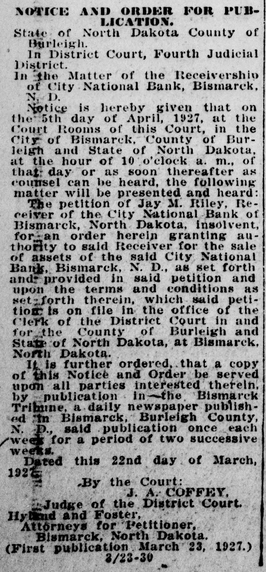 NOTICE AND ORDER FOR PUBLICATION. State of North Dakota County of Burleigh. In District Court, Fourth Judicial District. In the Matter of the Receivership of City National Bank, Bismarck, N. D. Notice is hereby given that on the 5th day of April, 1927, at the Court Rooms of this Court, in the City: of Bismarck, County of Burleigh and State of North Dakota, at the hour of 10 o'clock a. m., of that day or as soon thereafter as counsel can be heard, the following matter will be presented and heard: The petition of Jay M. Riley, Receiver of the City National Bank of Bismarck, North Dakota, insolvent, for an order herein granting authority to said Receiver for the sale of assets of the said City National Bank, Bismarck, N. D., as set forth and provided in said petition and upon the terms and conditions as set forth therein, which said petition: is on file in the office of the Clerk of the District Court in and for the County of Burleigh and State of North Dakota, at Bismarck, North Dakota. It is further ordered, that a copy of this Notice and Order be served upon all parties interested thereln, by publication in the Bismarck Tribune, a daily newspaper published "In Bismarck, Burleigh County, N. D., said publication once each week for a period of two successive weeks. Dated this 22nd day of March, 1927. ,By the Court: J. A. COFFEY, Judge of the District Court. Hyland and Foster, Attorneys for Petitioner, Bismarck, North Dakota. (First publication March 23, 1927.) 3/23-30